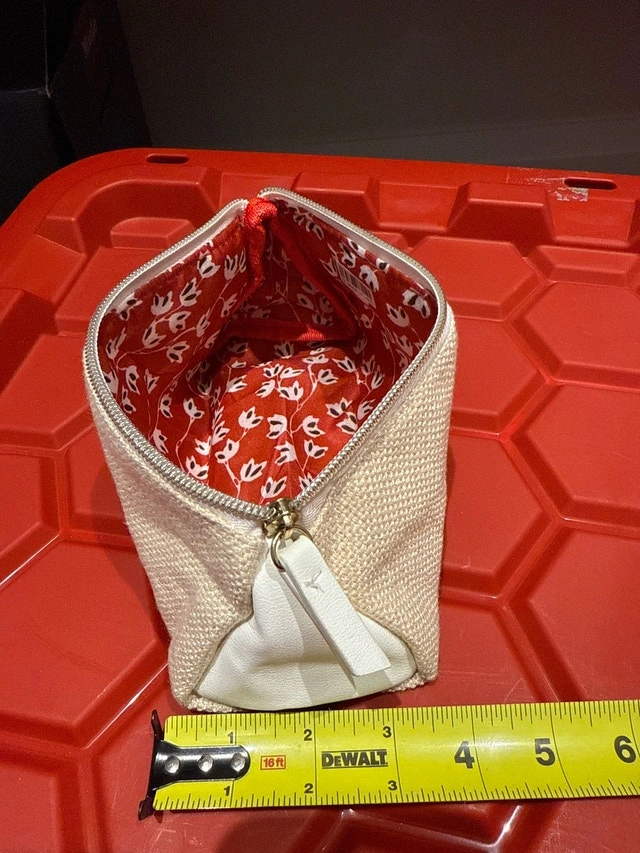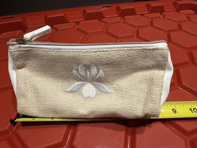 This is a brand new, small pouch with a cream-coloured woven exterior, an embroidered flower design, a white faux-leather base and zipper tab, and a red patterned interior lining. It's perfect for storing makeup, jewelry, or other small accessories. It measures approximately 9 inches in length. * Woven Exterior * Embroidered Flower Design * Faux-Leather Accents * Red Patterned Interior. If the ad is up, it's still available!