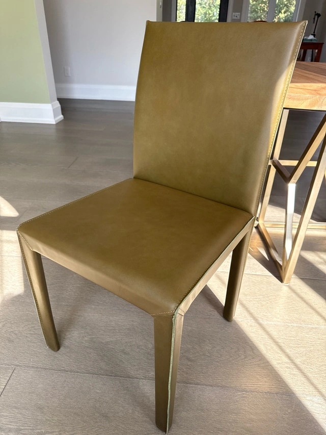 Selling a Crate and Barrel Folio side chair. This chair has a sleek, modern design with a comfortable upholstered seat and back, perfect for adding style to any dining space or office area. These were staging furniture and need to go. I have a total of 4 available, all are brand new. A bundle price is available if you're interested in multiple. They are super easy to match with your style and incredibly durable. Details: Brand: Crate and Barrel, Model: Folio Side Chair, Upholstery: Olive-toned leather, Frame: Sturdy metal, Style: Modern/Contemporary. If the ad's still up, it's still available.