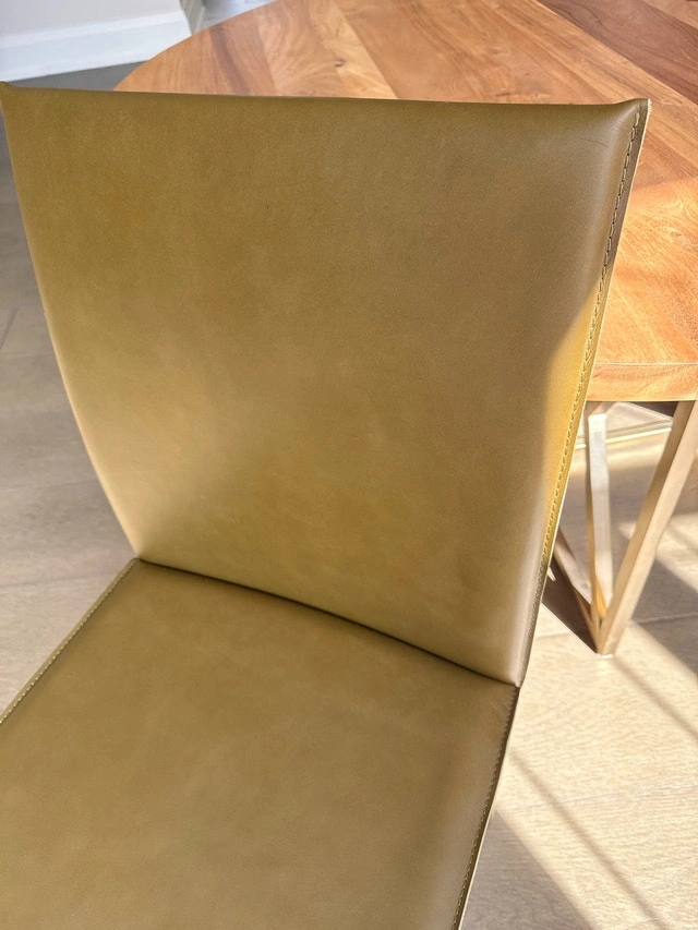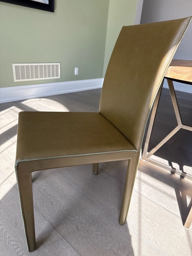 Selling a Crate and Barrel Folio side chair. This chair has a sleek, modern design with a comfortable upholstered seat and back, perfect for adding style to any dining space or office area. These were staging furniture and need to go. I have a total of 4 available, all are brand new. A bundle price is available if you're interested in multiple. They are super easy to match with your style and incredibly durable. Details: Brand: Crate and Barrel, Model: Folio Side Chair, Upholstery: Olive-toned leather, Frame: Sturdy metal, Style: Modern/Contemporary. If the ad's still up, it's still available.