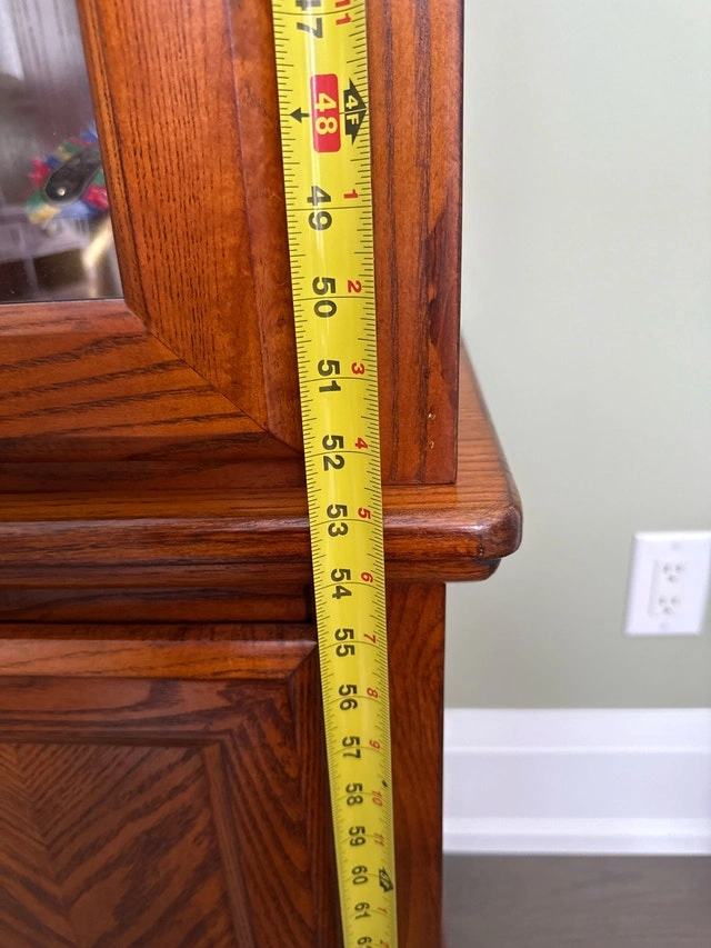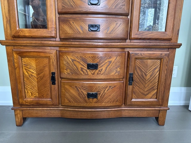 This used oak china cabinet is perfect for displaying your treasured items, featuring glass doors and a warm finish. It's in good condition, ready to add elegance to your dining or living room. Material: Oak wood. Door type: Glass. Drawers: 3. Doors: 3. There are two cabinets together. The bottom one is 26” height.
