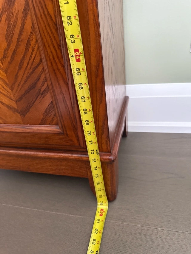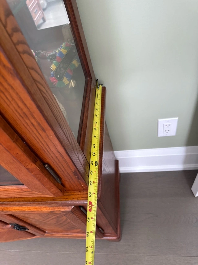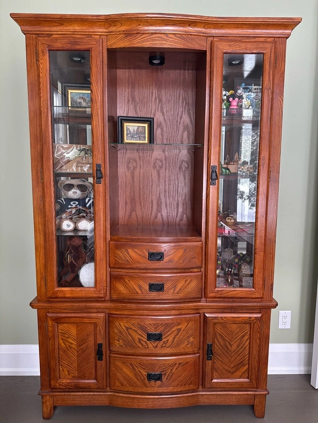 This used oak china cabinet is perfect for displaying your treasured items, featuring glass doors and a warm finish. It's in good condition, ready to add elegance to your dining or living room. Material: Oak wood. Door type: Glass. Drawers: 3. Doors: 3. There are two cabinets together. The bottom one is 26” height.
