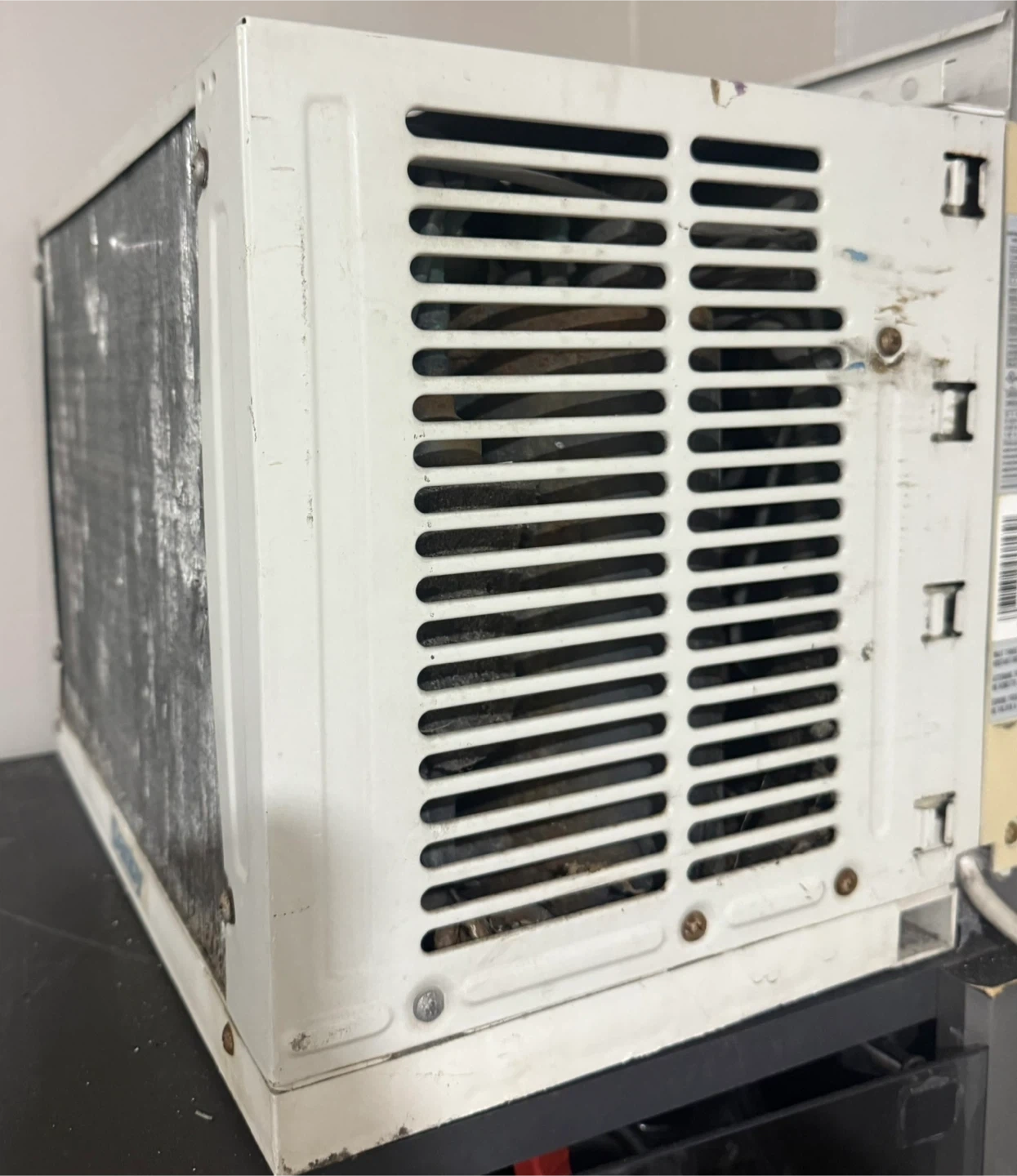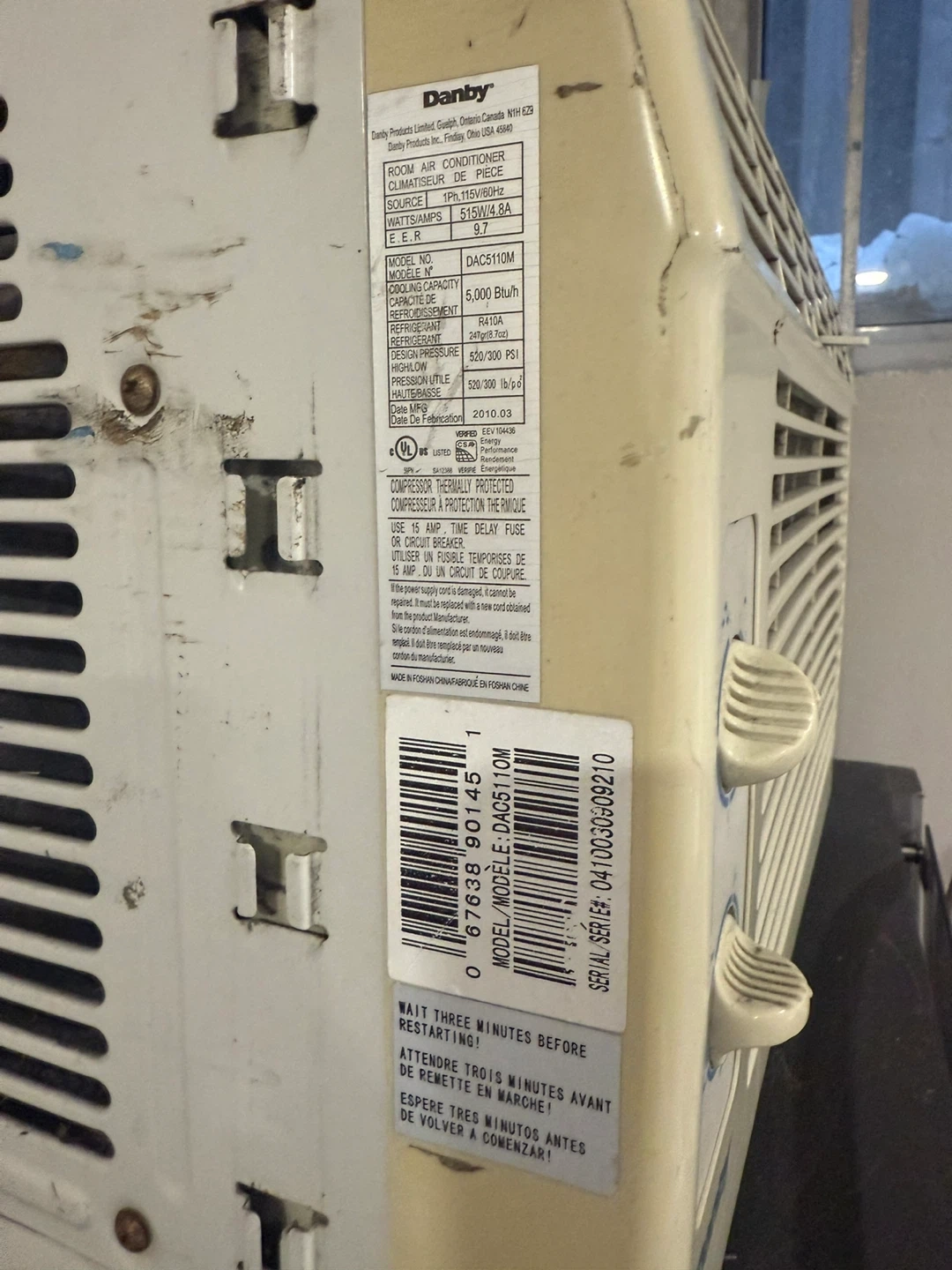 This is a Danby 5,000 BTU room air conditioner. It's a 115V unit. The manufacturing date is March 2010. It has dual knobs for settings.