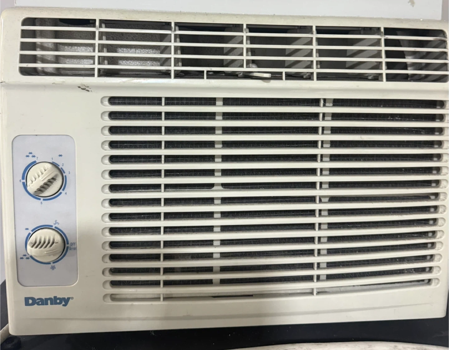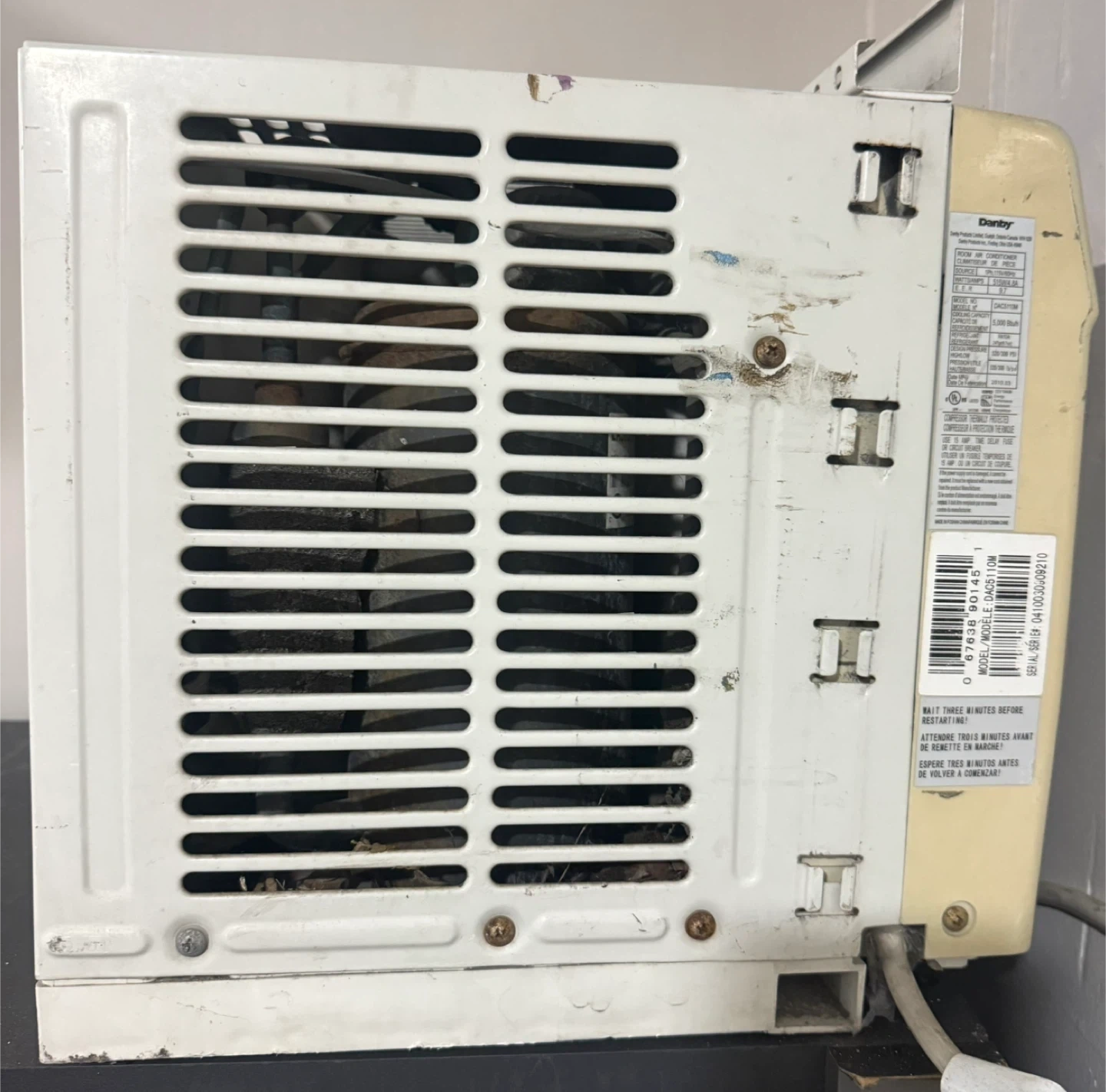 This is a Danby 5,000 BTU room air conditioner. It's a 115V unit. The manufacturing date is March 2010. It has dual knobs for settings.
