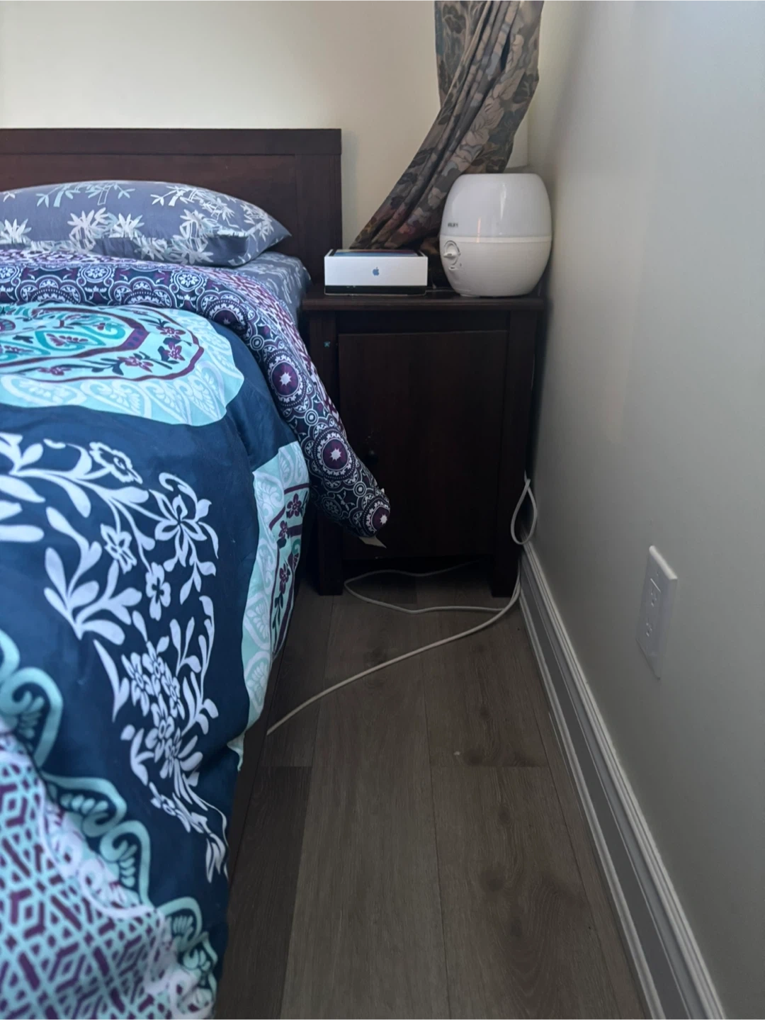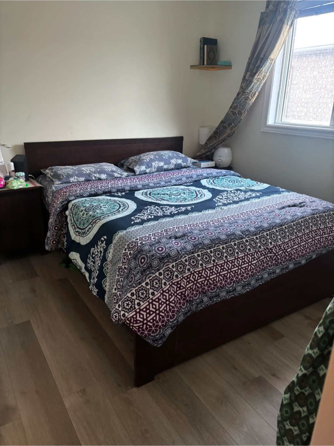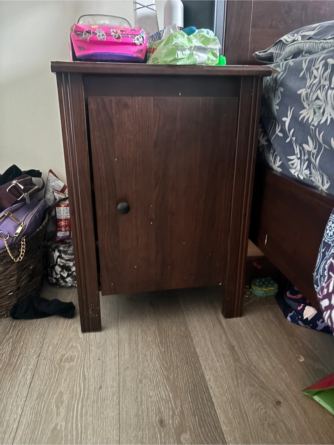 This is a dark wood nightstands with a single door. It's a handy piece of furniture for your bedroom. Its simple design fits most decors.