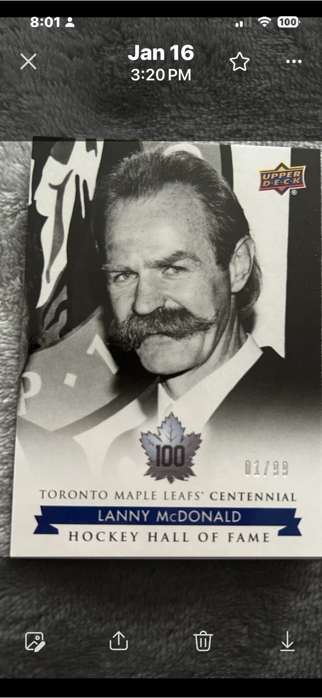 This is a Upper Deck card celebrating Lanny McDonald and the Toronto Maple Leafs Centennial. It's serial numbered 01/99. This card commemorates his induction into the Hockey Hall of Fame. It's a must-have for any hockey collector!
