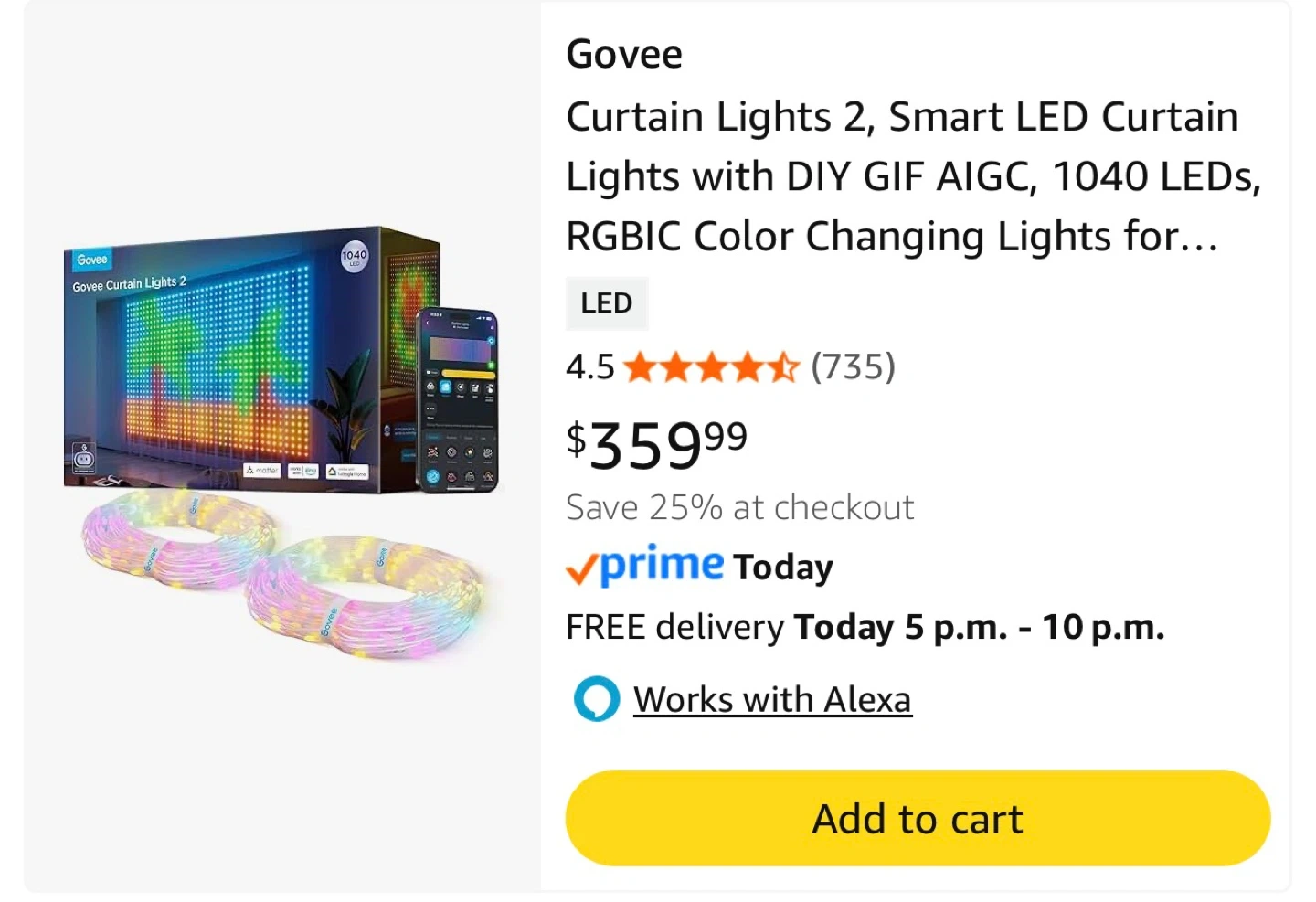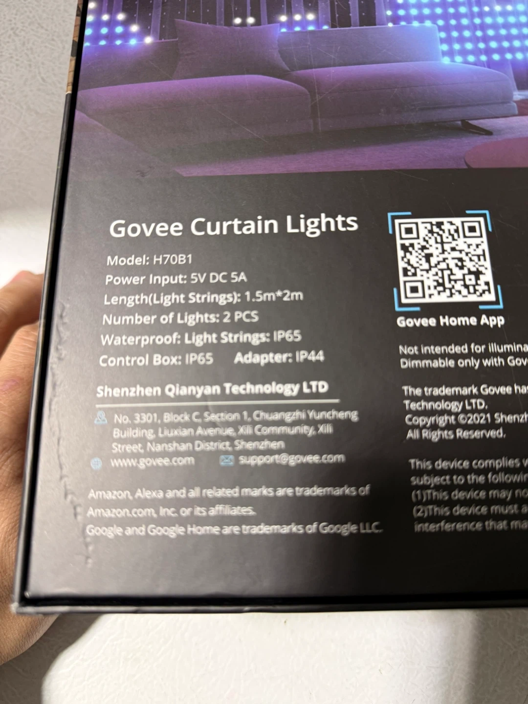 Govee Curtain Lights H70B1. Power input 5V DC 5A. Length 1.5m by 2m. Waterproof light strings IP65. Control box IP65, adapter IP44. Works with Alexa and Google Home.