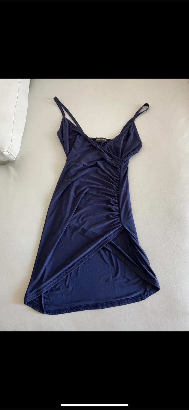 This is a navy blue PrettyLittleThing bodycon dress. It's a size medium with spaghetti straps and a ruched detail. Made from a stretchy material. Xs/s