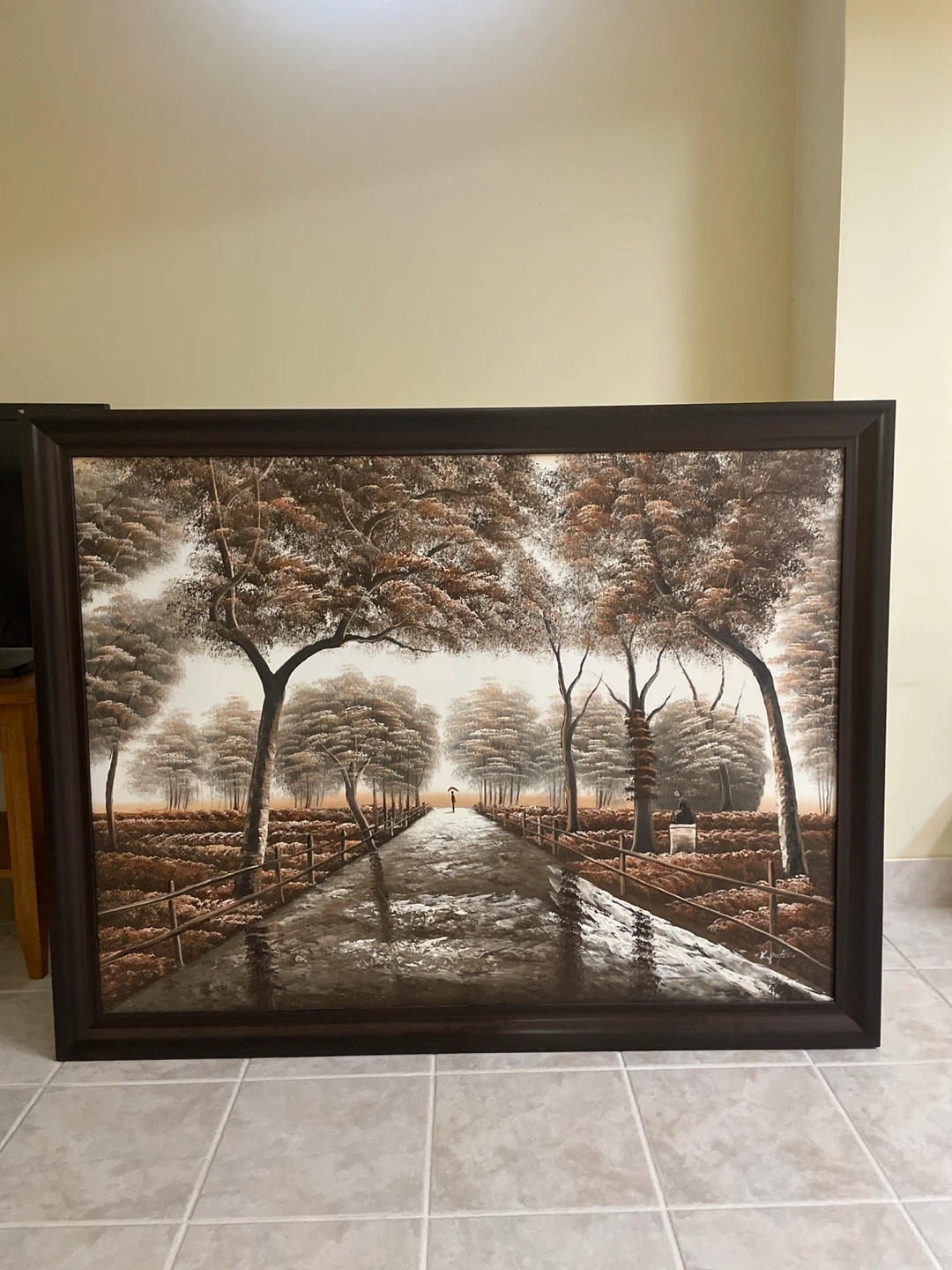This framed painting depicts a serene forest scene with a reflective body of water. It's a beautiful piece to add to your home decor. The art features a detailed rendering of trees and natural light.