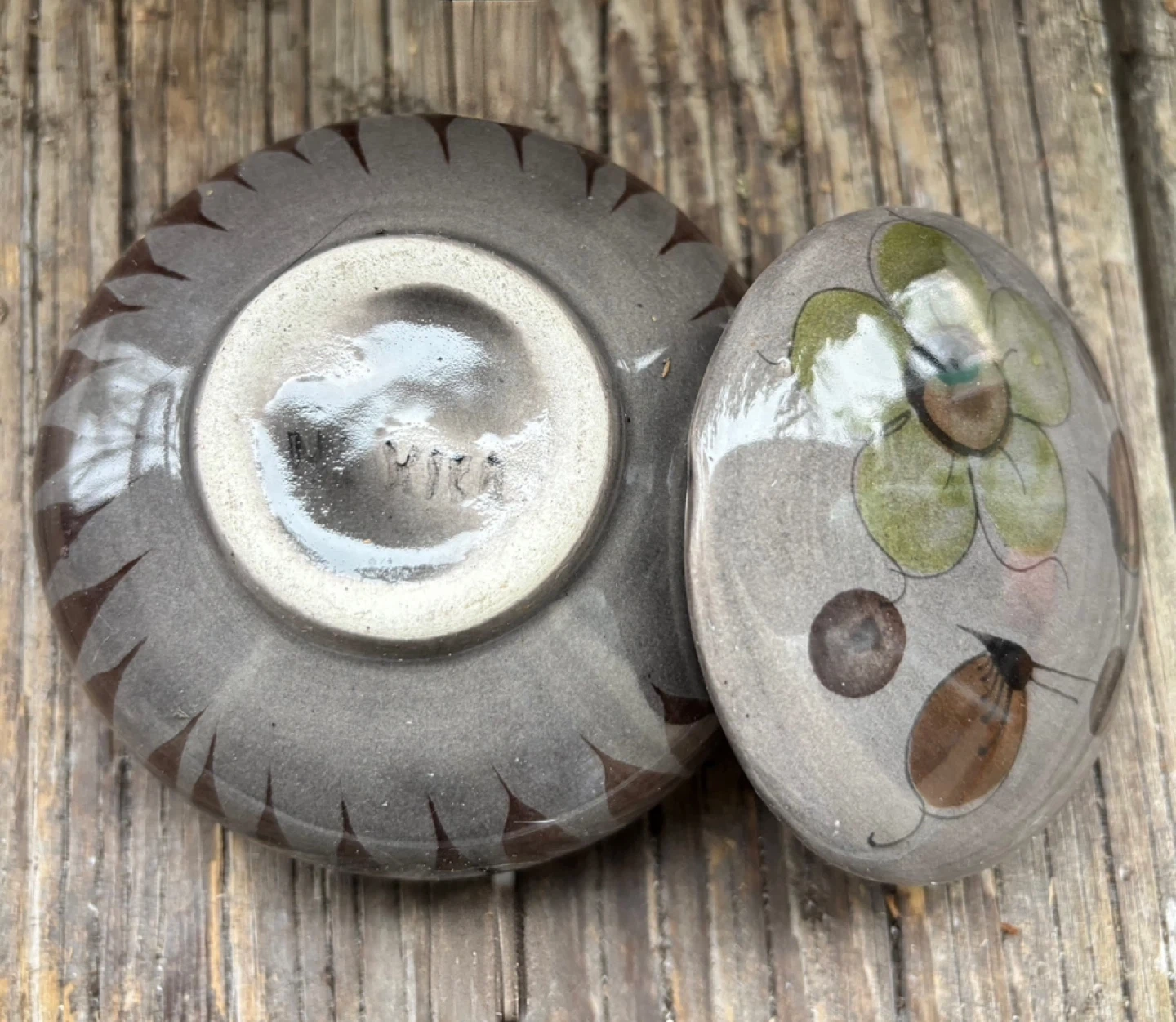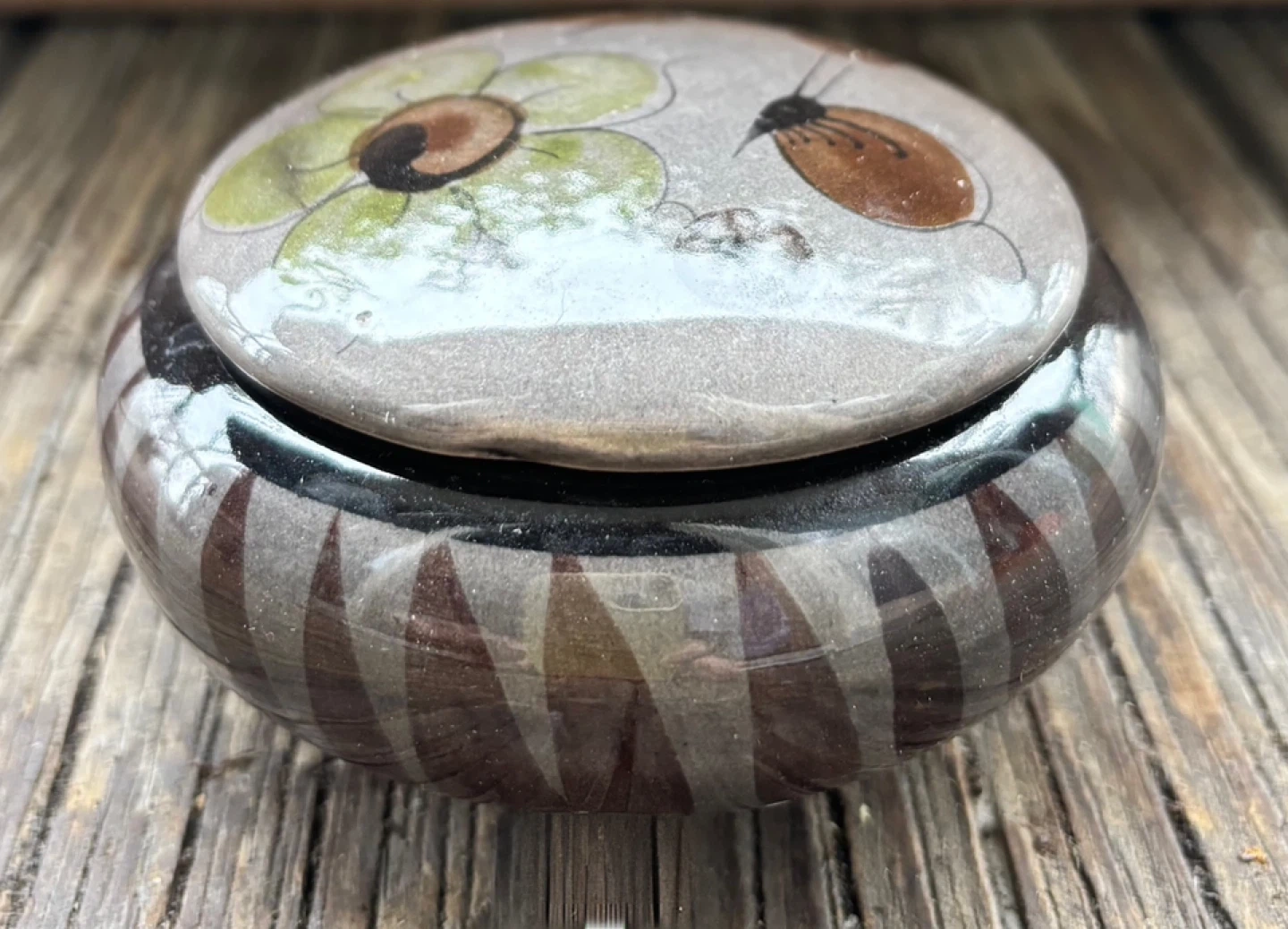 Vintage Painted Ceramic Jar with Lid, Gray with Floral Motif