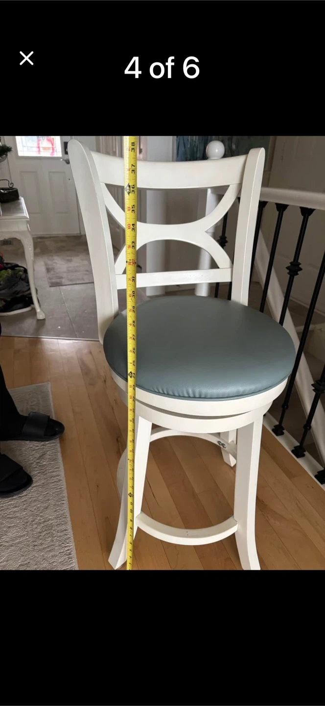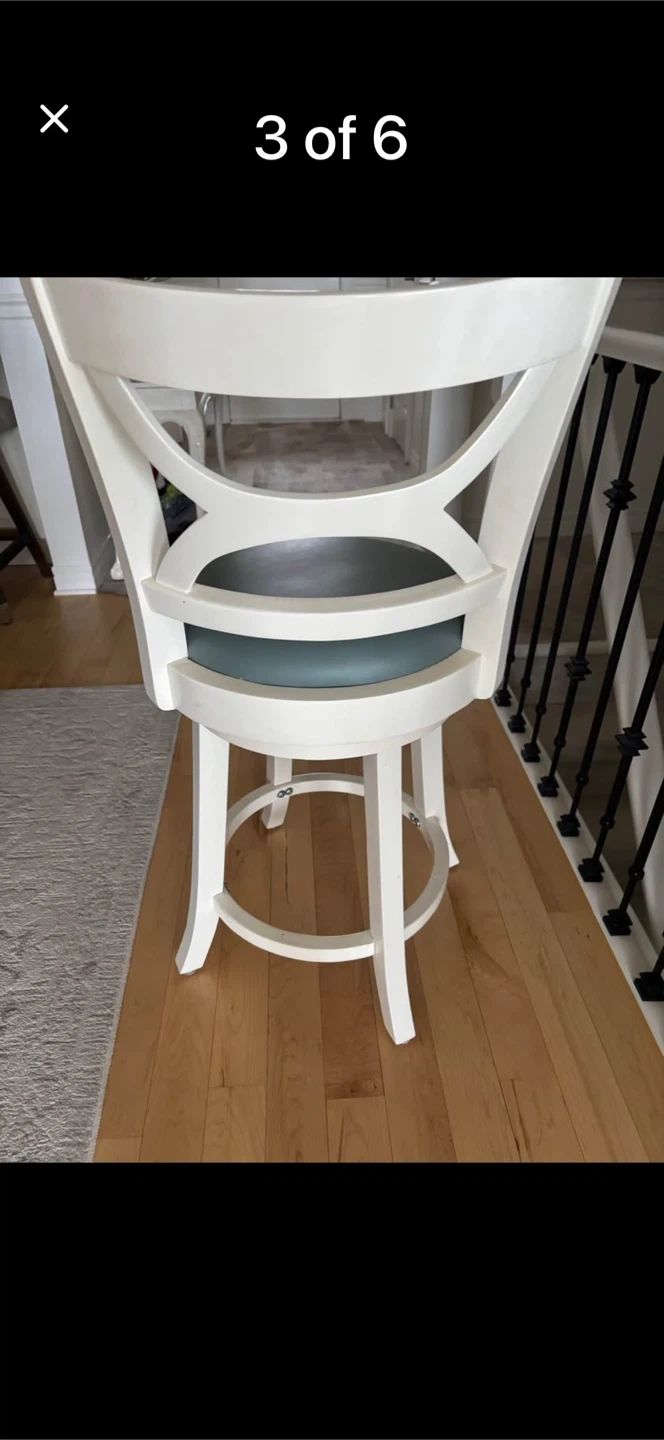 White swivel bar stool with a blue upholstered seat. The stool's back has a decorative crosshatch design. Seat height is approximately 29 inches.