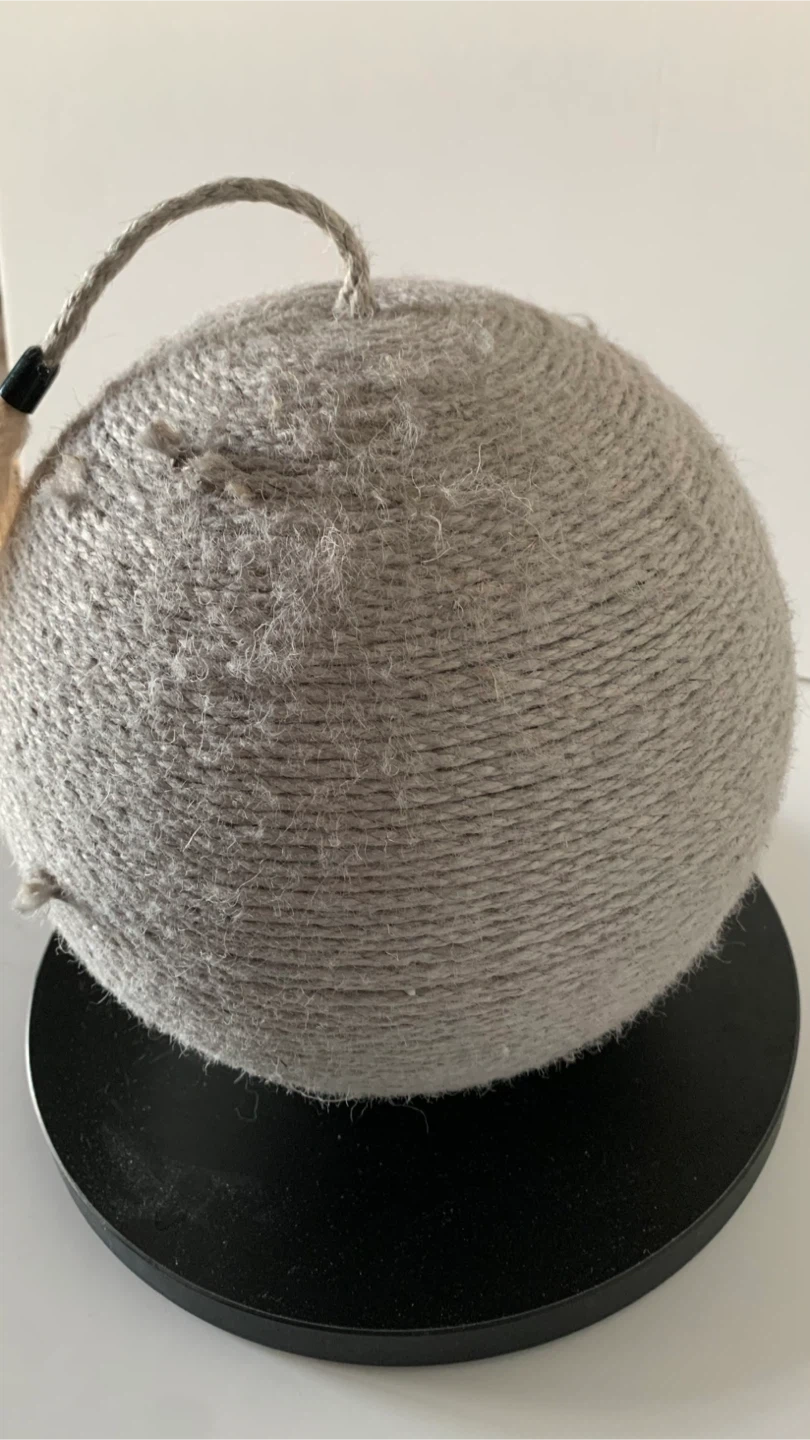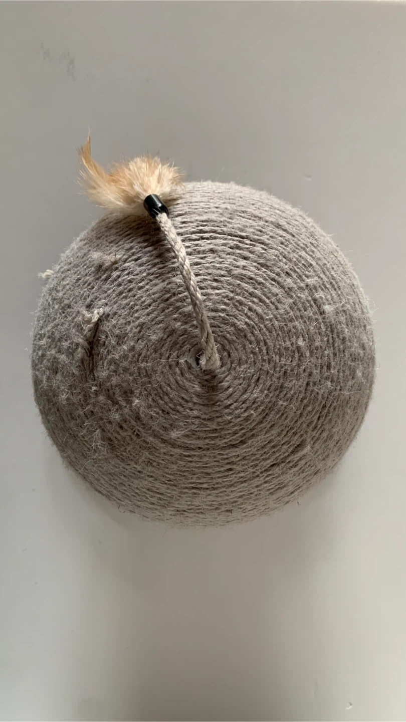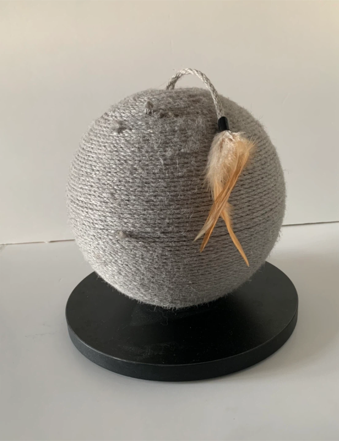 This is a spherical cat scratching toy wrapped in sisal rope. It has a small feather dangling from a rope loop on top. It's built on a sturdy black base. It's great for keeping your cat entertained and their claws healthy!