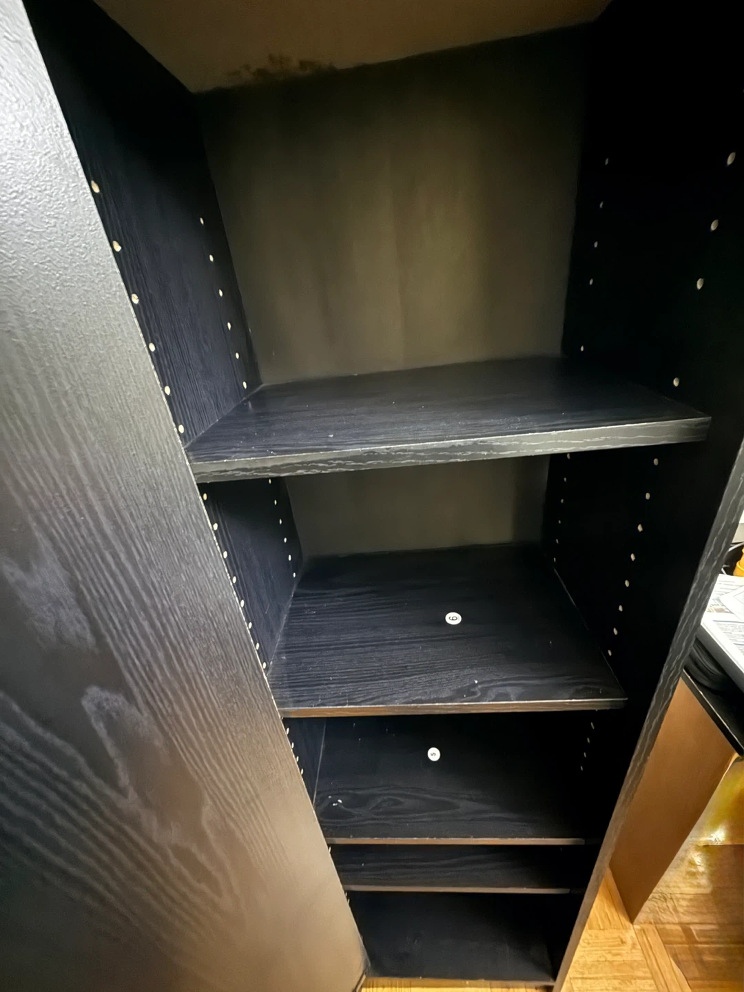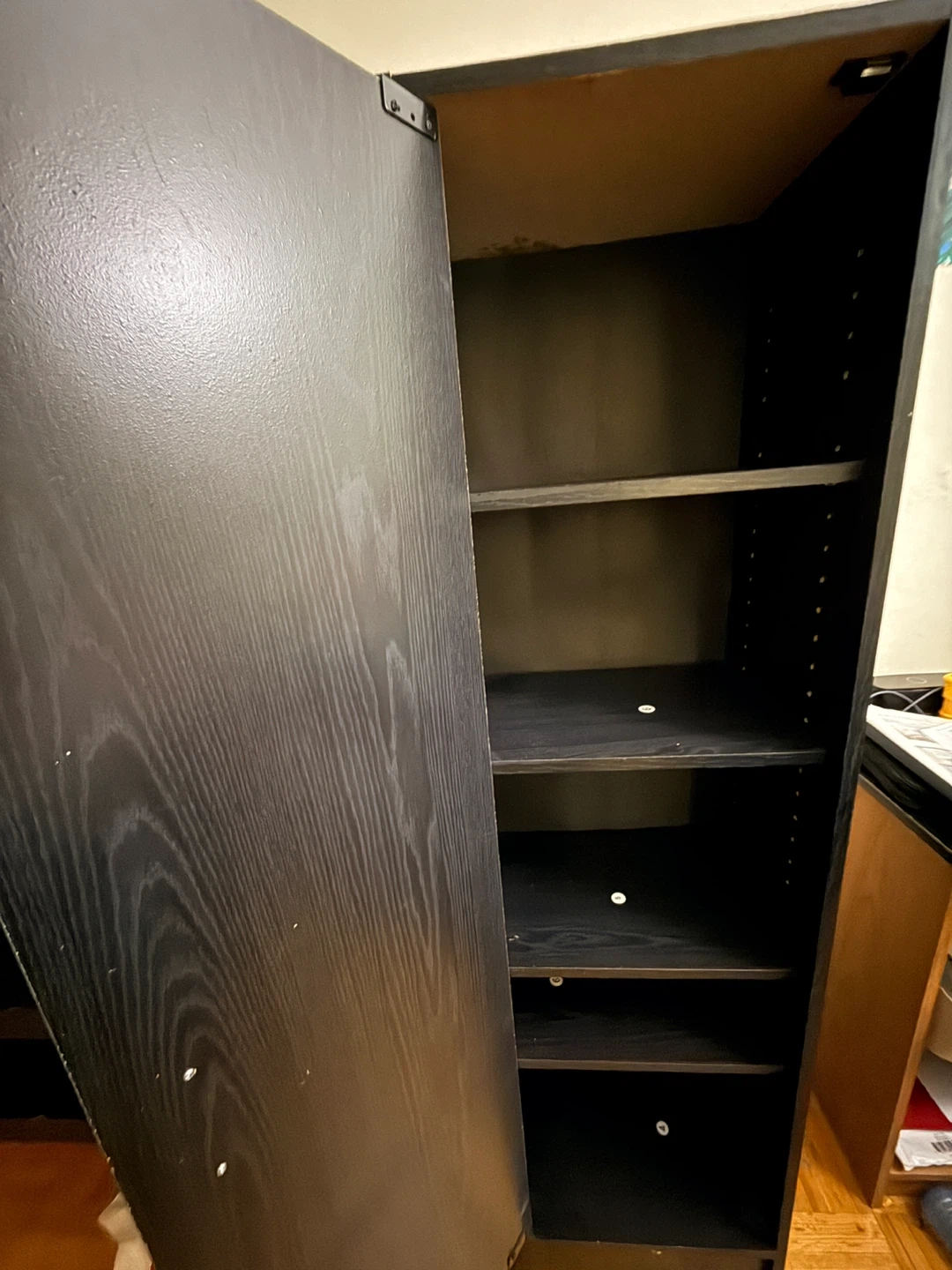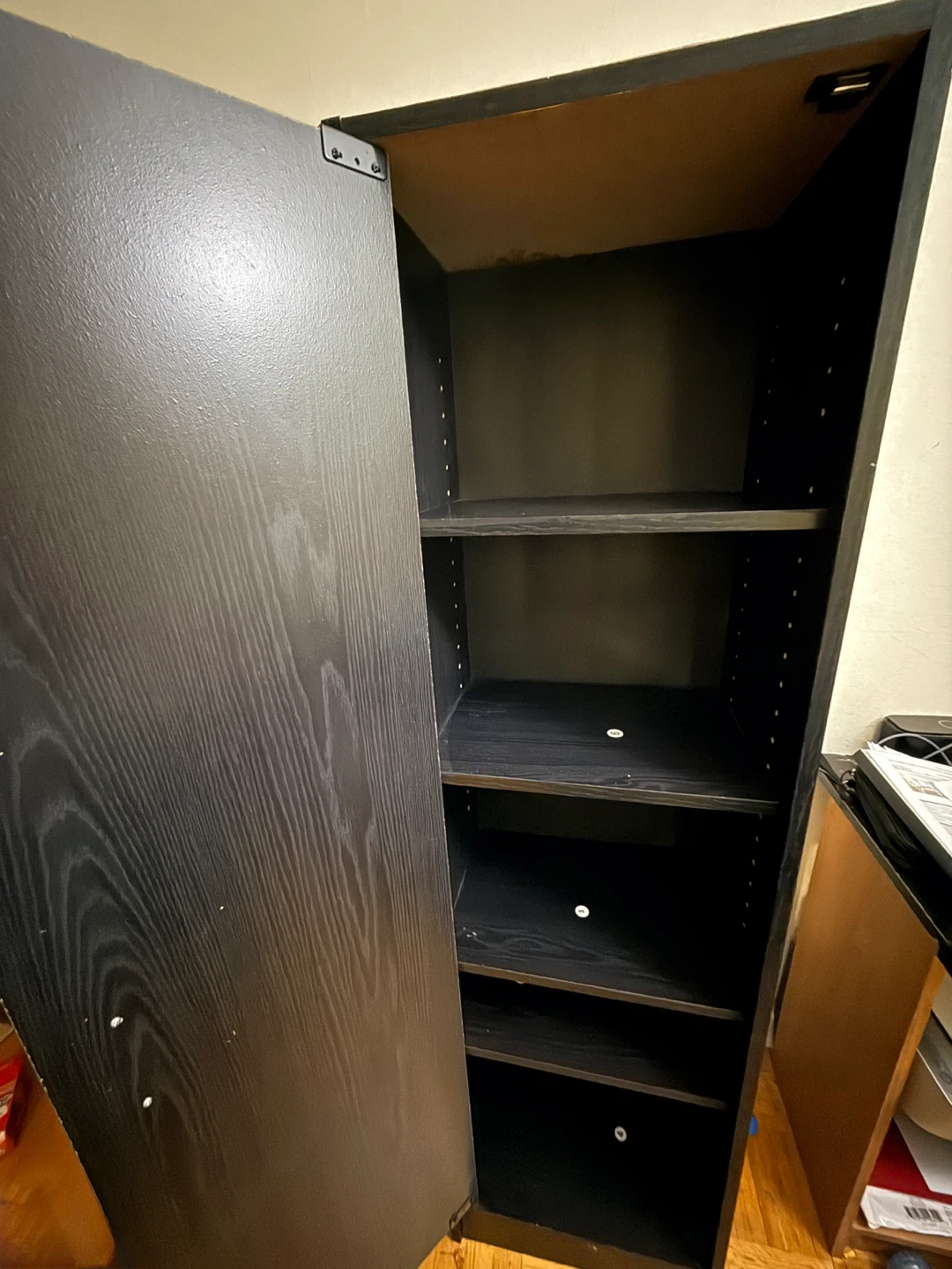 This is a tall, black storage cabinet with a single door. It has multiple shelves for organizing your items. The cabinet is made of wood composite and has a dark wood grain finish. It's suitable for storing books, linens, or general household goods.