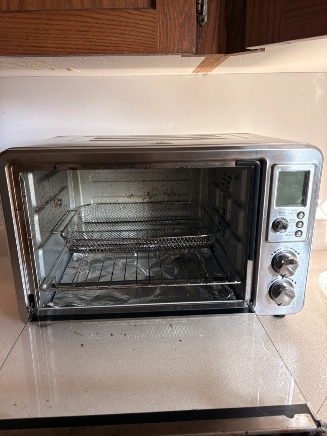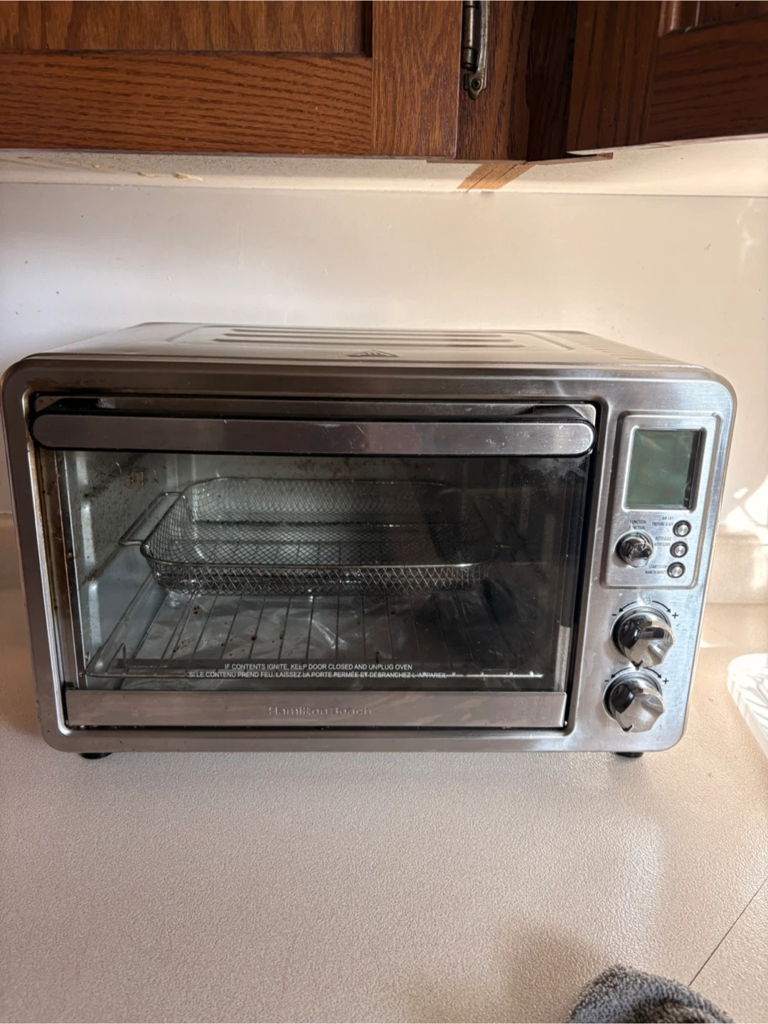 This Hamilton Beach toaster oven is a versatile kitchen appliance. It includes a wire rack and an air fry basket. It has multiple cooking functions.