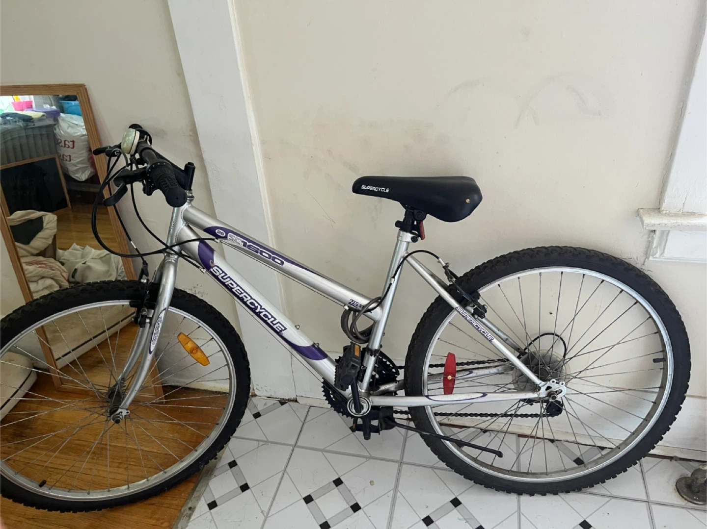 Silver Supercycle mountain bike with purple accents. It has 26-inch wheels and a comfortable black seat. Includes a bell and reflectors. Ready for your next ride!