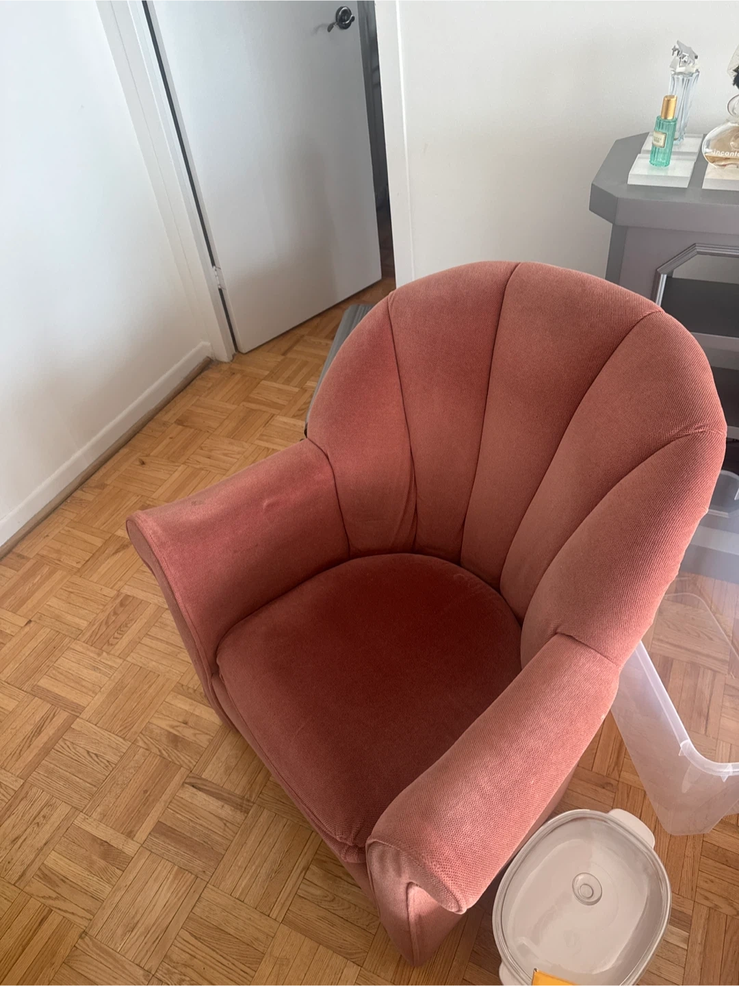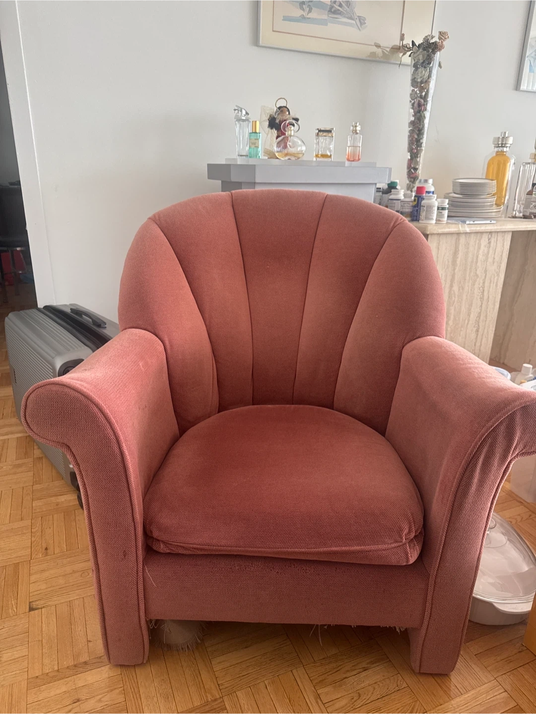A comfy upholstered accent chair in a lovely shade of pink. It's got a unique shell-shaped back design and padded arms for extra comfort. Fabric material with a bit of wear on one armrest.