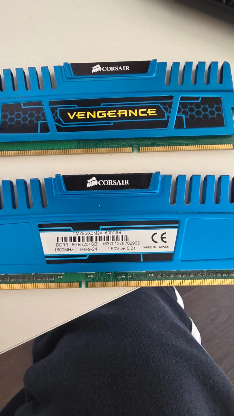 Selling a pair of Corsair Vengeance DDR3 RAM modules. Total capacity is 8GB, with two 4GB sticks. They run at 1600MHz with timings of 9-9-9-24 and a voltage of 1.50V. These are blue heat spreaders for cooling. This RAM is great for upgrading a desktop computer's performance!