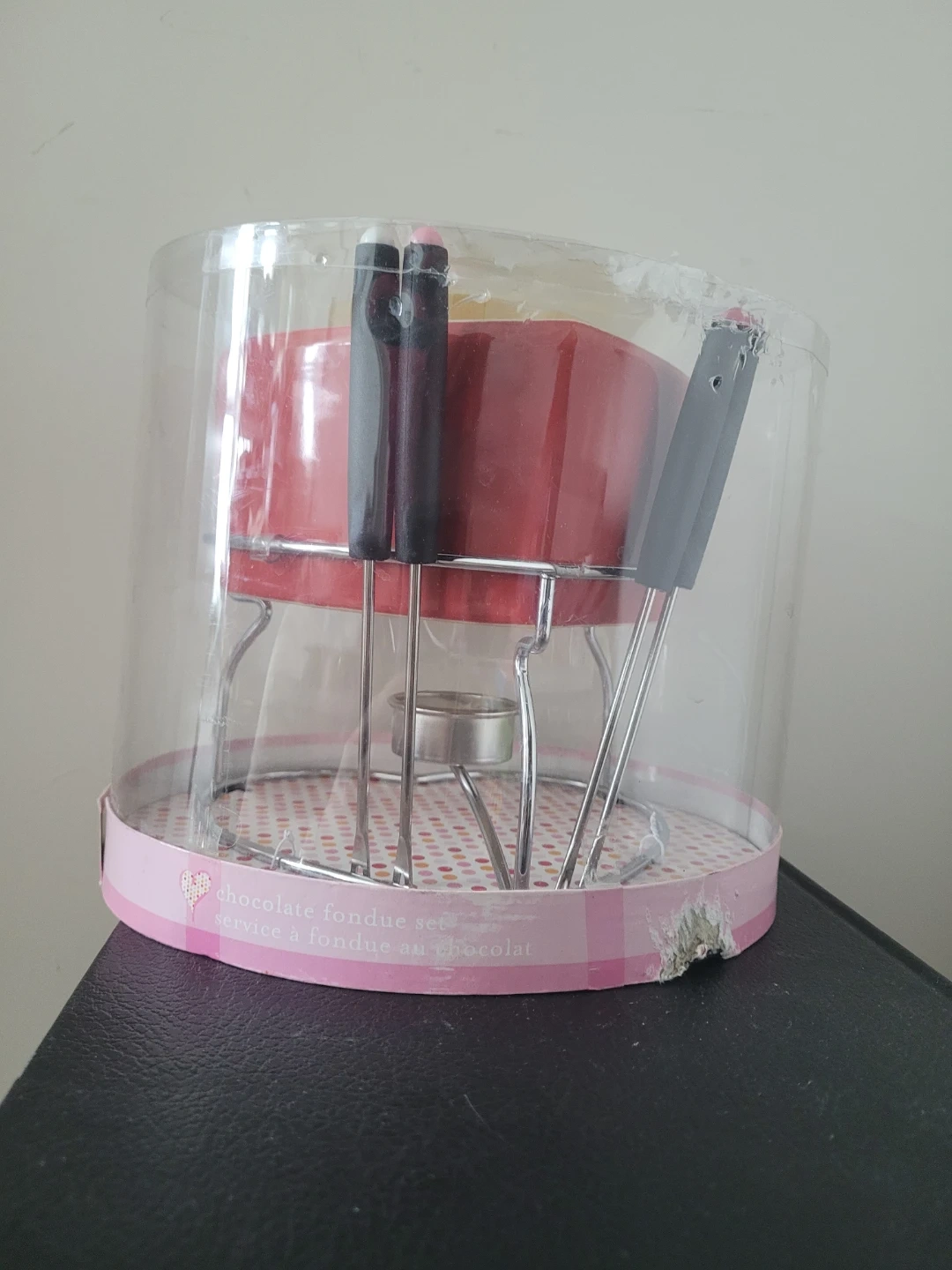 This heart shaped chocolate fondue set includes a red fondue pot with a holder for a tea light candle and two dipping forks. It's perfect for sharing a sweet treat with someone special!