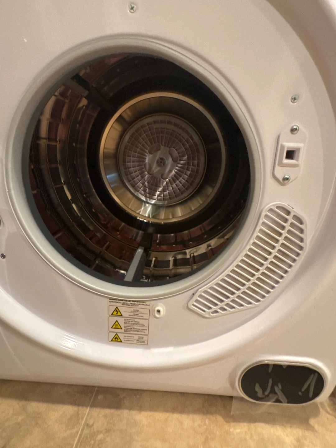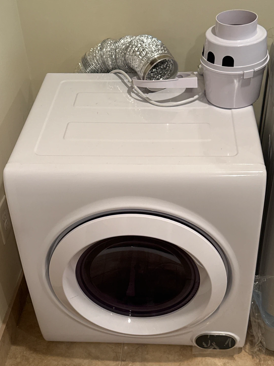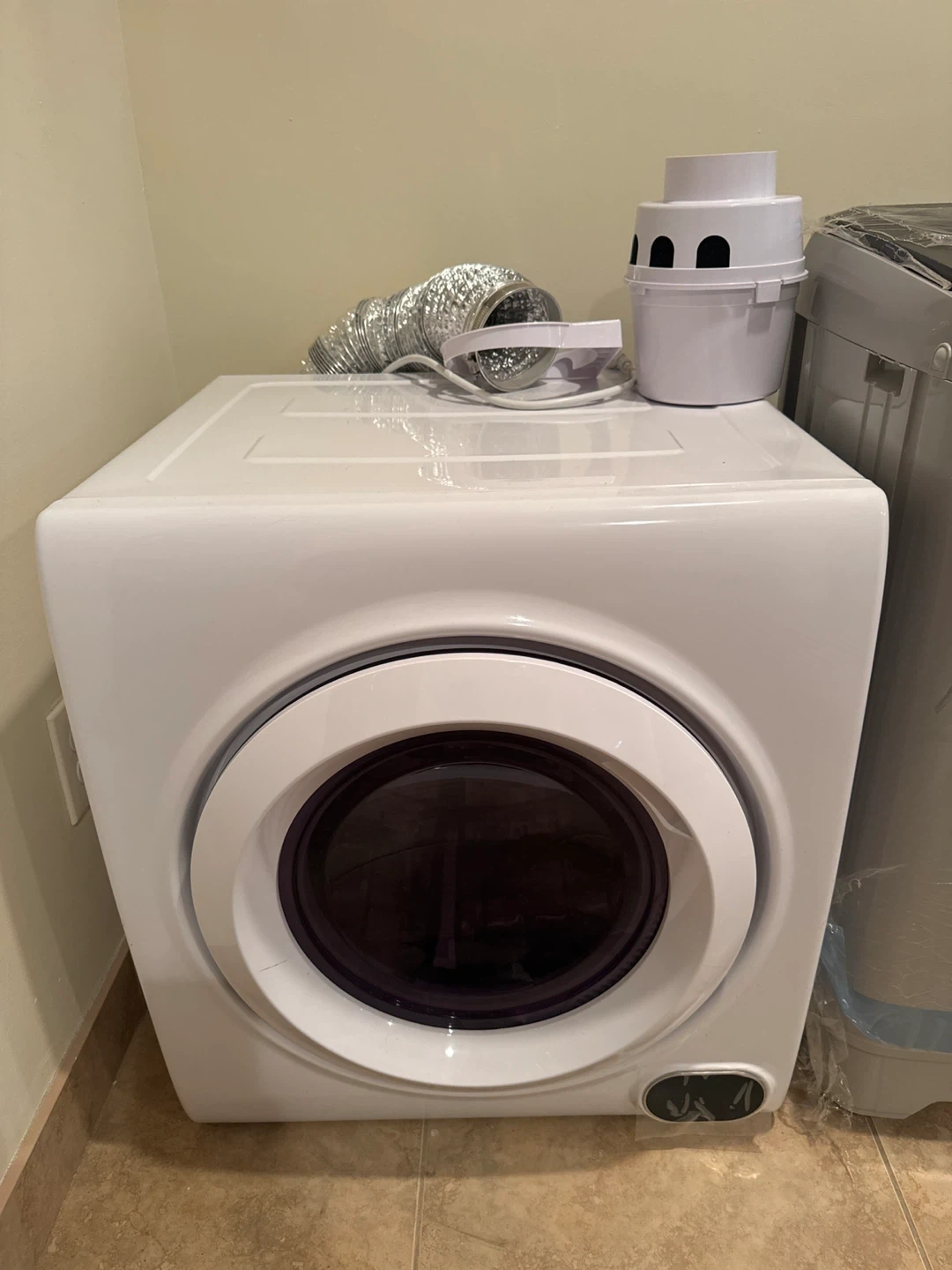 This is a compact clothes dryer. It includes a flexible exhaust hose and vent adapter. Great for small spaces or apartments! Size 2x2x2 Ft touch screen control. 110v