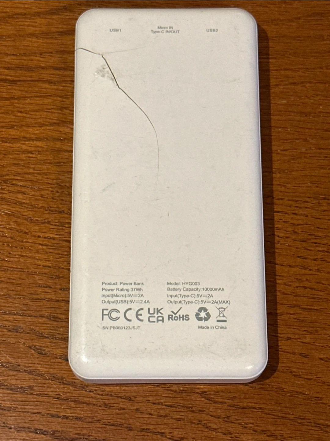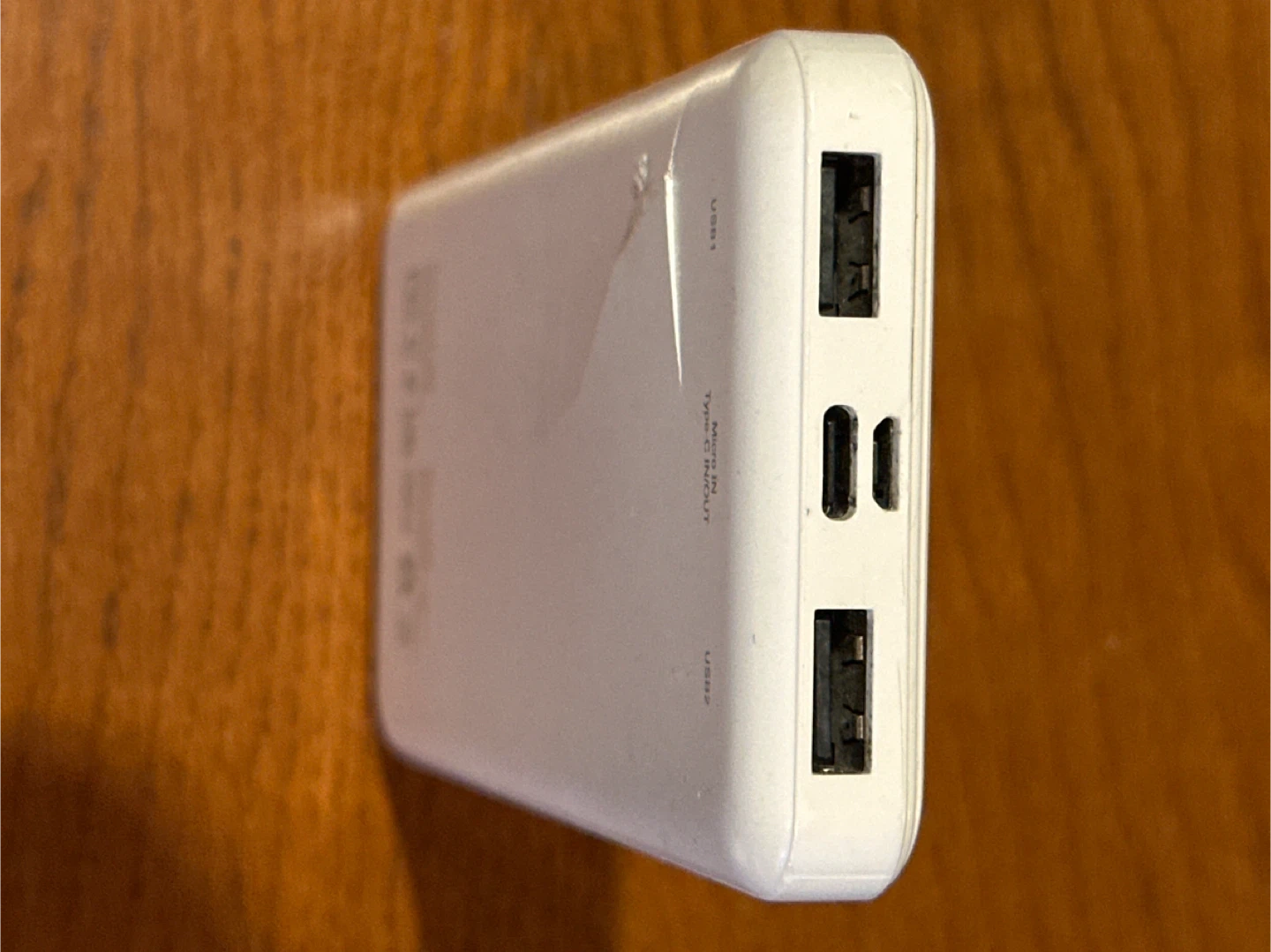 White AsperX power bank with a 10000mAh battery capacity. It has two USB-A ports for output and one Micro USB and one Type-C port for input. The model is HYC003.