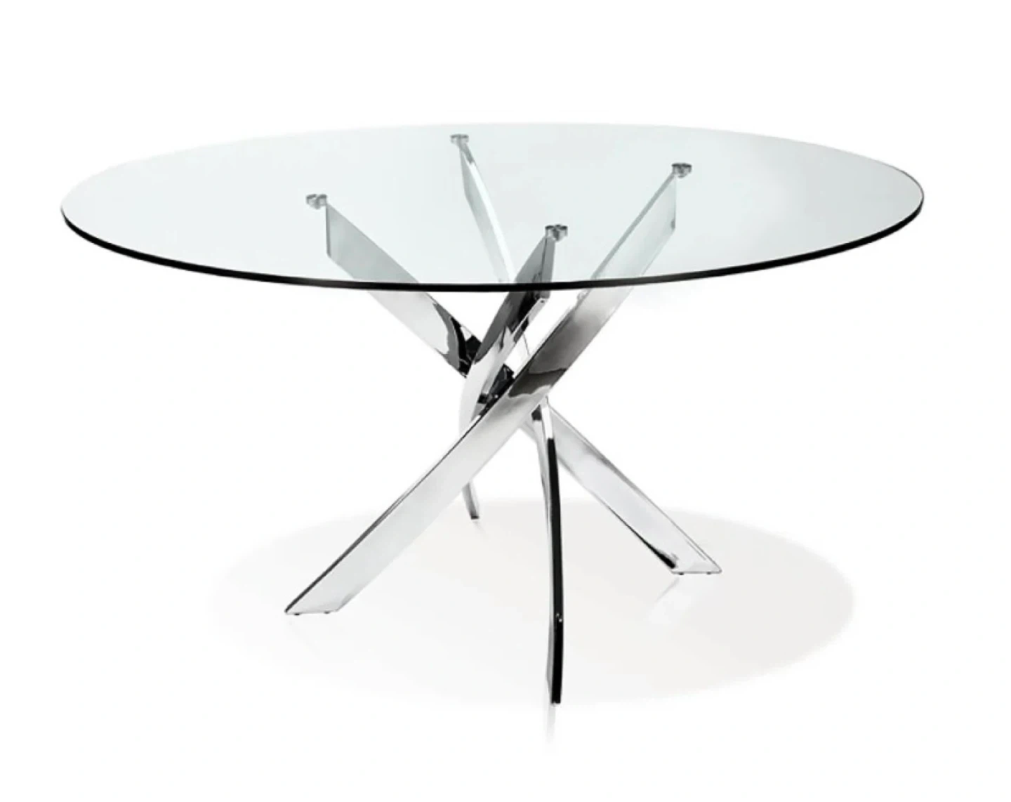 Round glass top dining table with a unique chrome metal base. It's a stylish piece that would complement a modern dining room. Glass material. Metal base. Excellent condition. Comes with 4 black padded stylish chairs