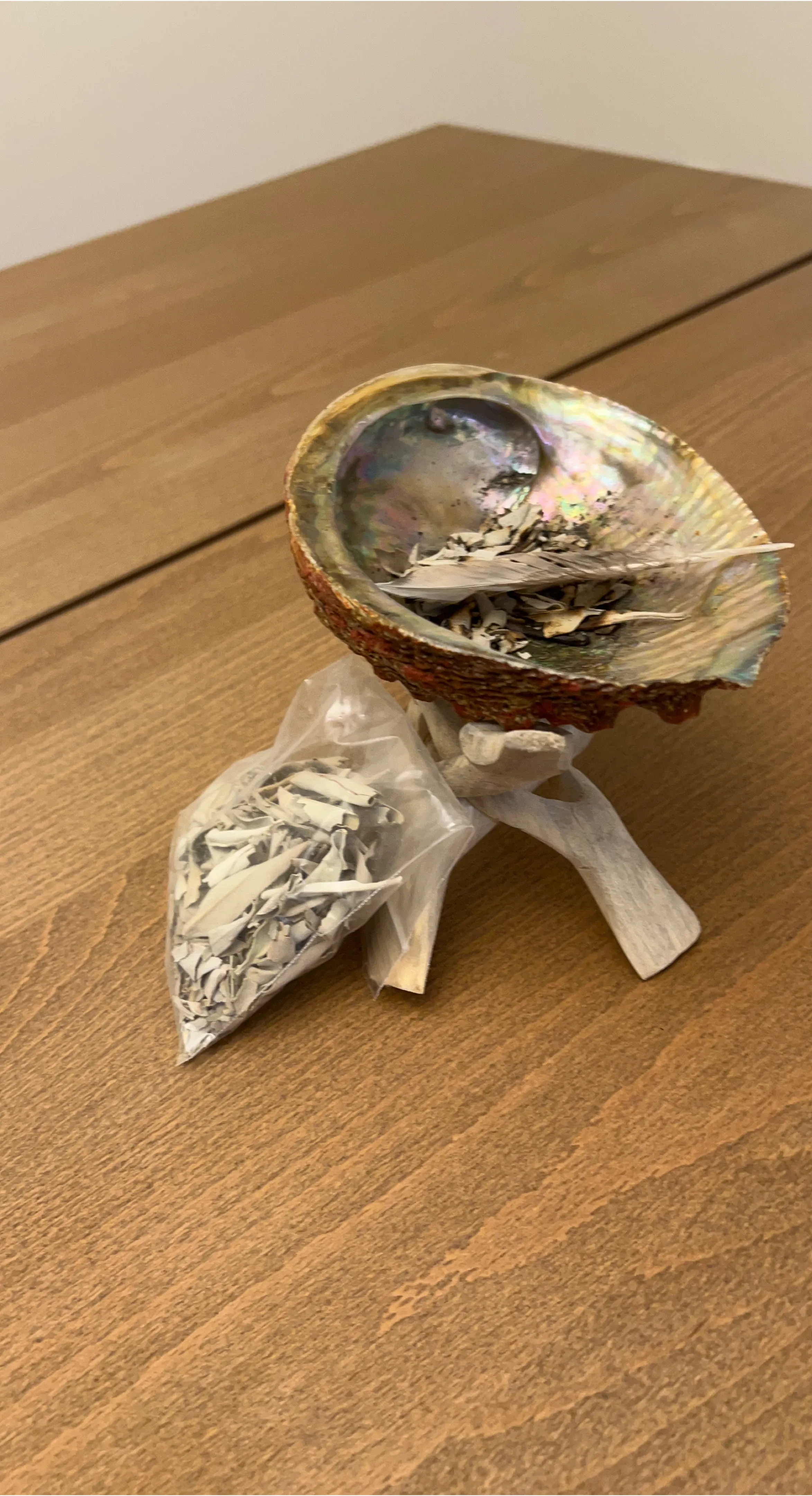 This abalone shell smudge bowl comes with a bundle of white sage and a feather. It's on a wooden stand. Used for smudging and clearing spaces. Perfect for spiritual practices!