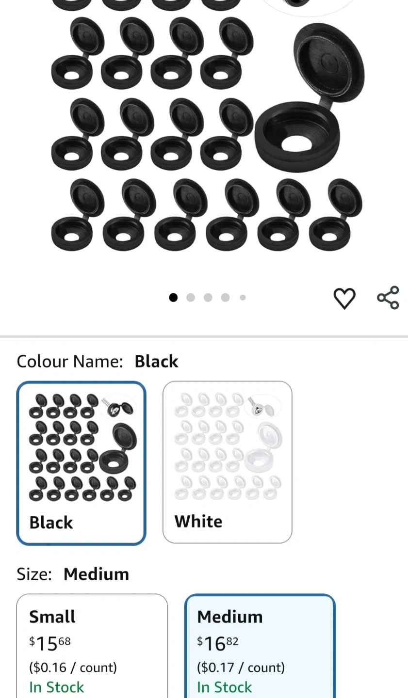 This is a lot of 100 black plastic hinged screw cover caps. They are a medium size. These caps are useful for covering screw heads on furniture or other projects.