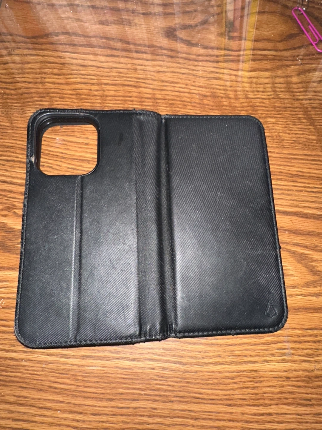 This is a black folio wallet case with card slots. It's designed to hold a phone securely. This case is useful for keeping your phone and cards together.