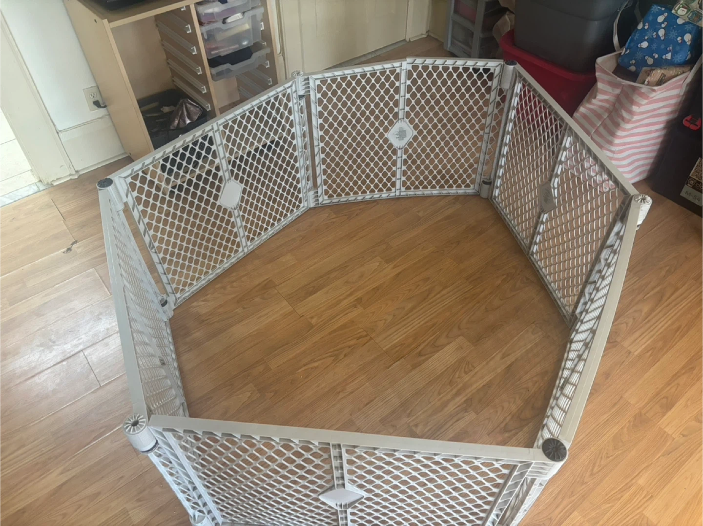 This is a versatile white plastic playpen with a mesh design. It's configurable into different shapes to suit your space needs. Great for keeping little ones or pets safely contained!