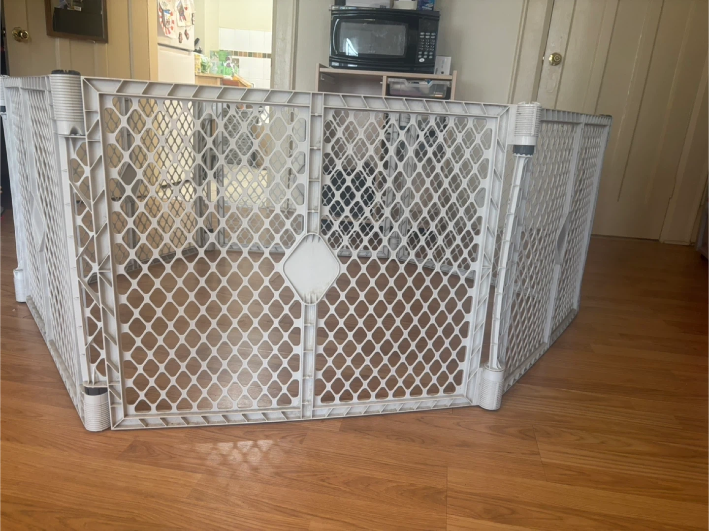 This is a versatile white plastic playpen with a mesh design. It's configurable into different shapes to suit your space needs. Great for keeping little ones or pets safely contained!
