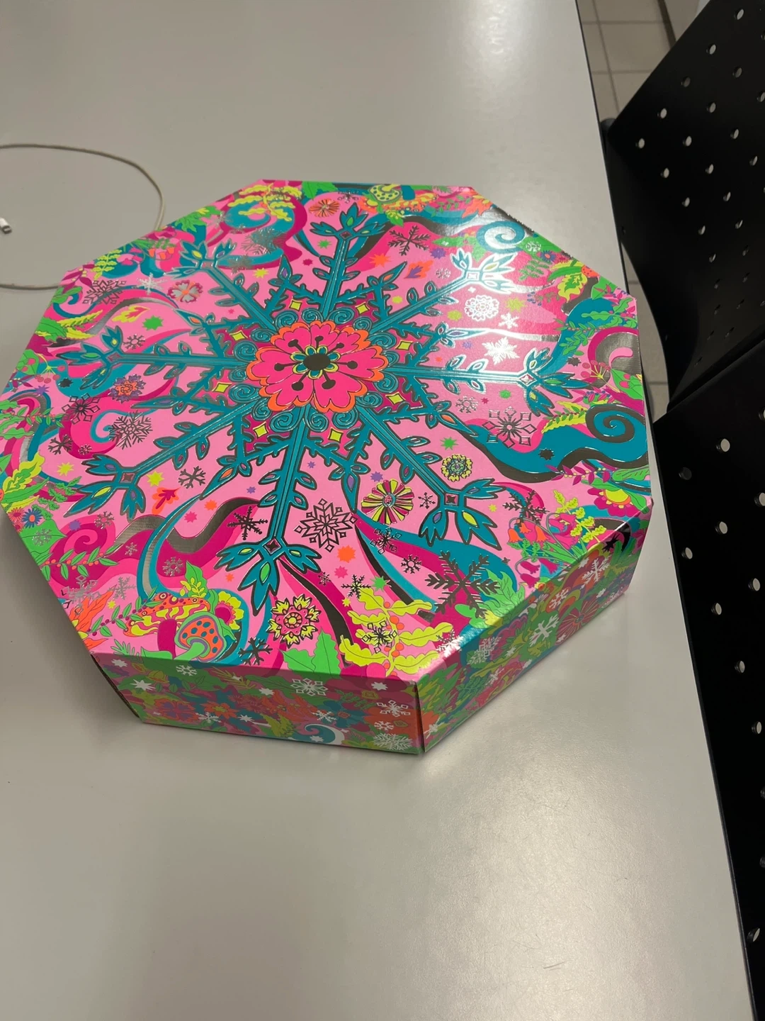This octagonal box features a vibrant, colourful design. It's ideal for storing small items or as a unique gift presentation. The sturdy cardboard construction ensures it'll hold its shape.