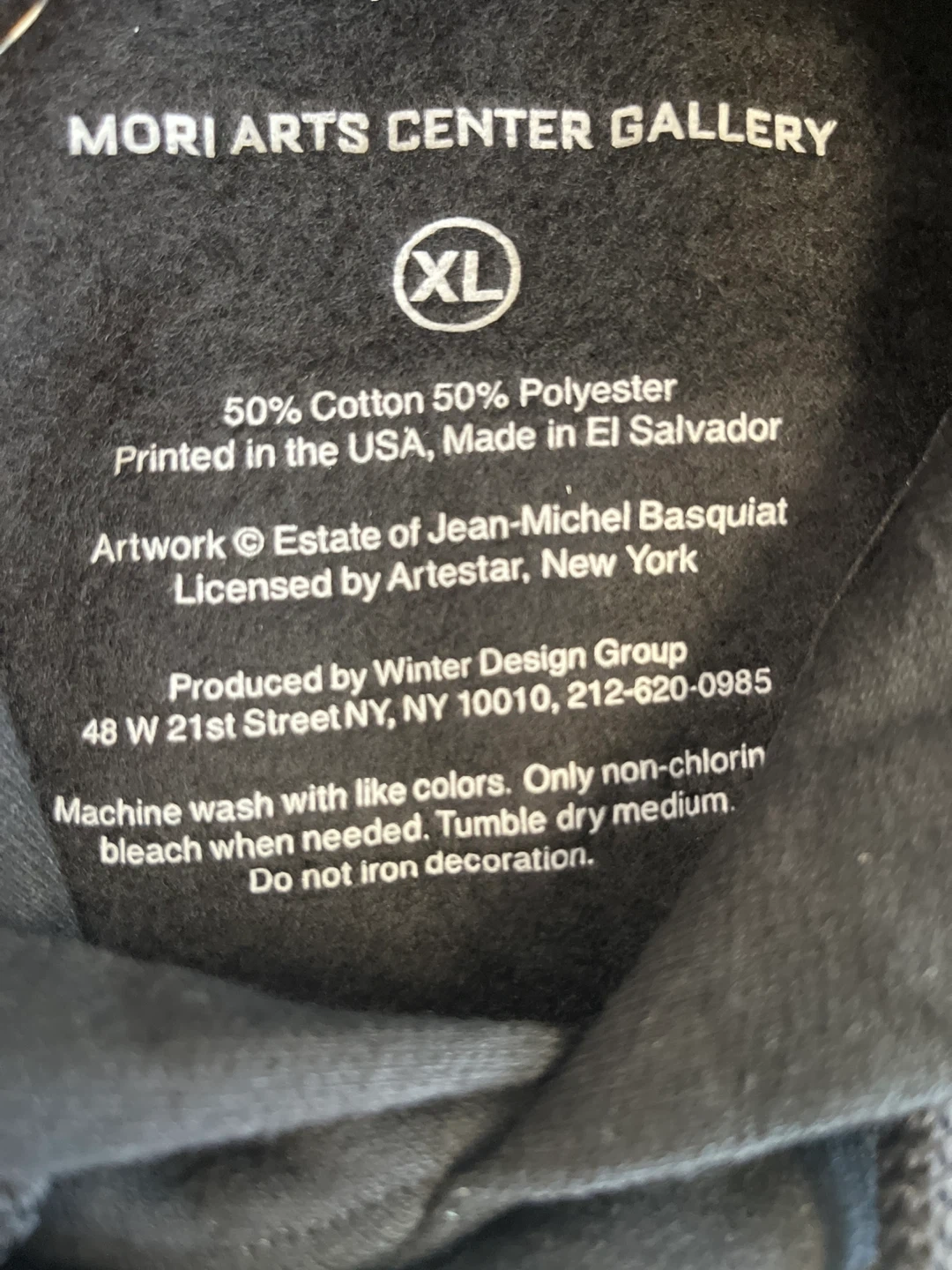 Black hoodie featuring Jean-Michel Basquiat artwork. 50% cotton, 50% polyester. Made in El Salvador. Printed in the USA.