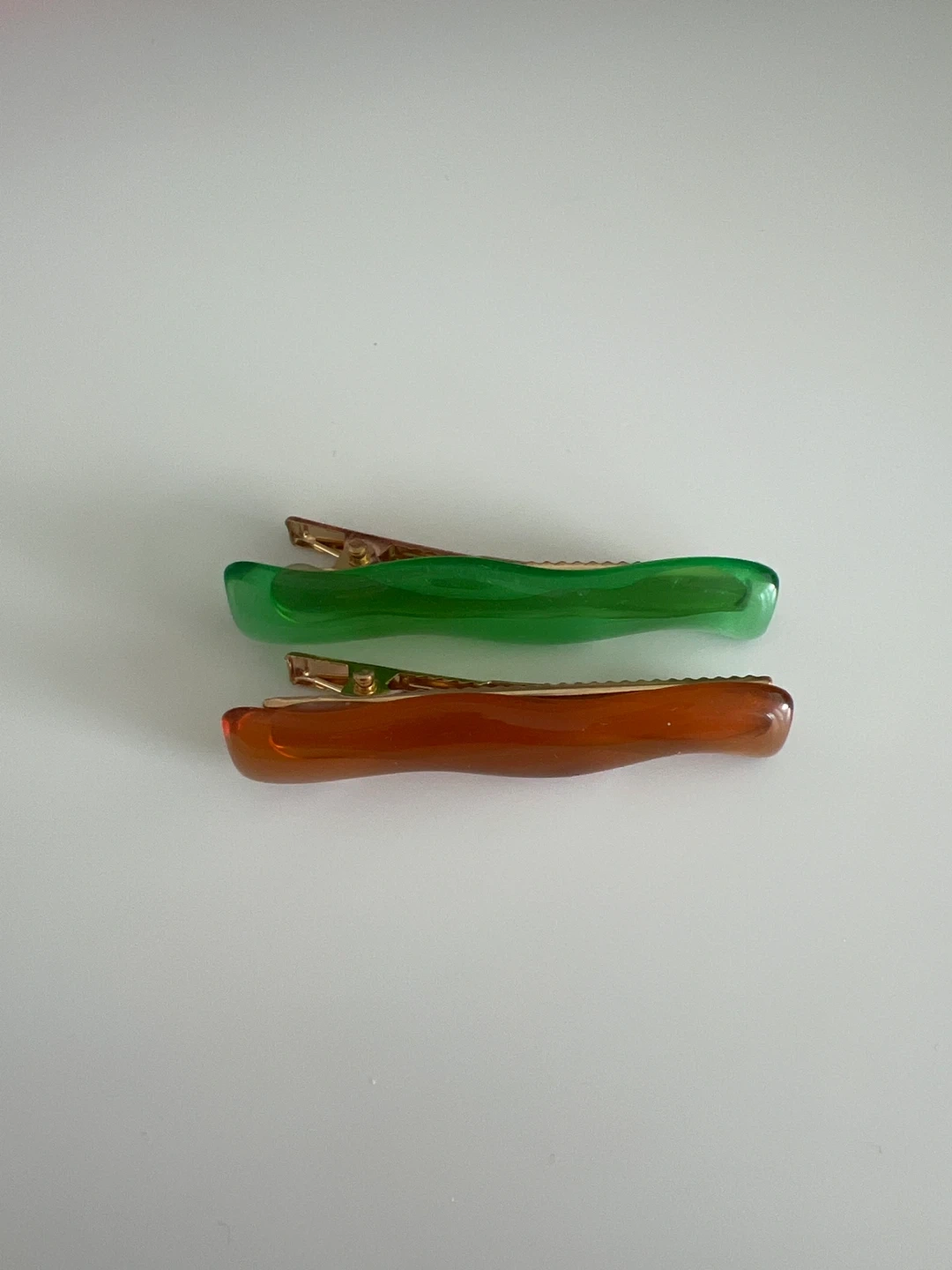 Includes two hair clips, one green and one brown. They're made of a translucent, resin-like material with gold-toned clasps.