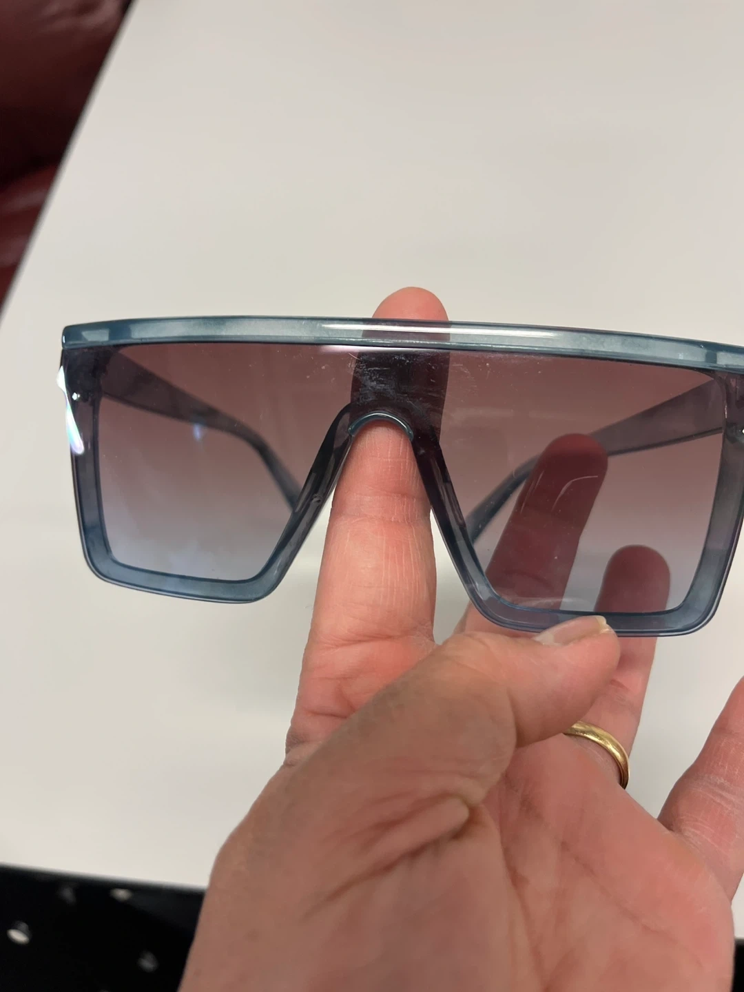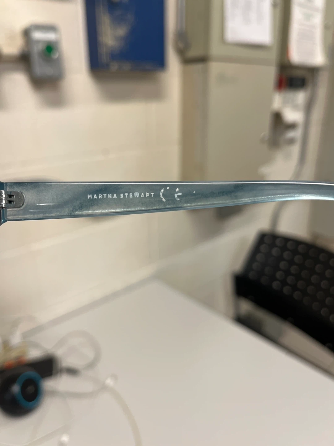 Blue plastic framed sunglasses by Martha Stewart. Features tinted lenses and a stylish, modern design. Great for everyday wear!