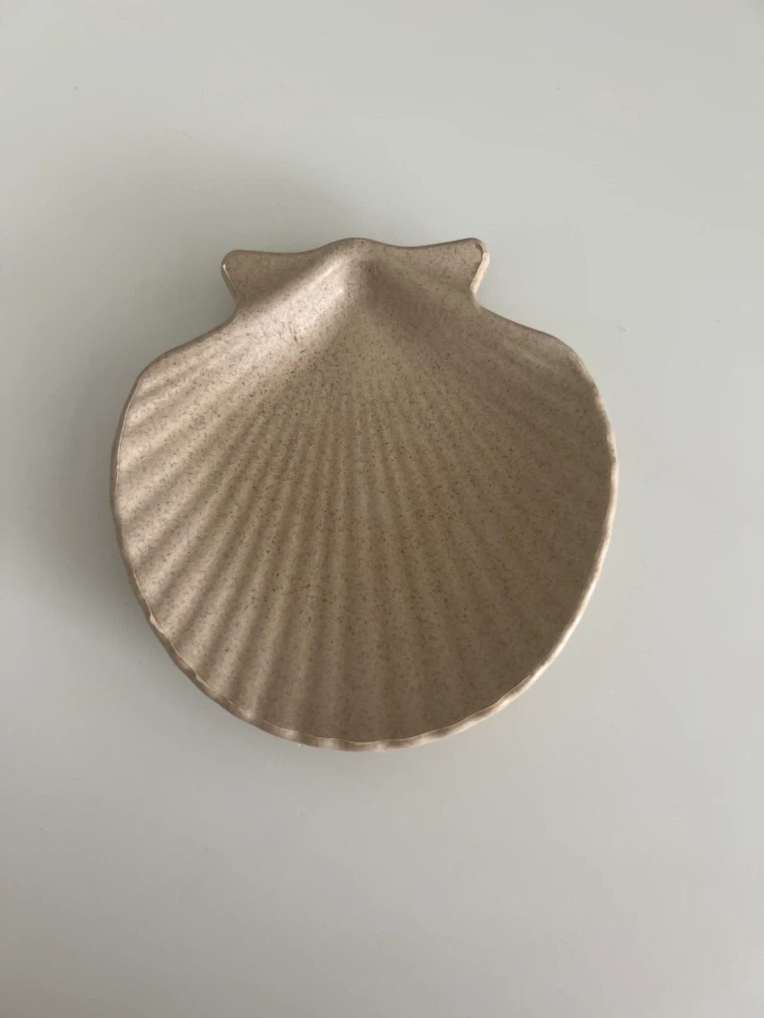 A small plate shaped like a scallop shell. It's a light beige colour with speckles. Made from a sturdy material, possibly ceramic or a composite.