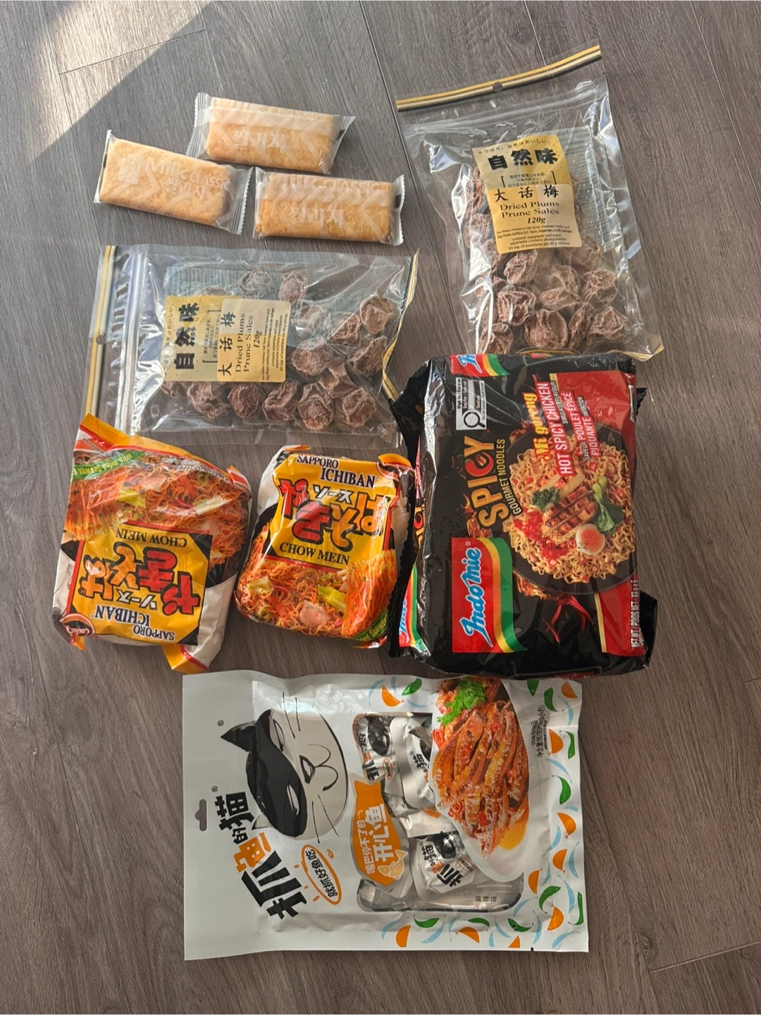 A bundle of snacks including dried plums, spicy chicken ramen, and other chow mein varieties. Also includes individual fish snacks with a spicy flavour. Everything is unopened. Perfect for a quick and tasty snack anytime!