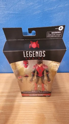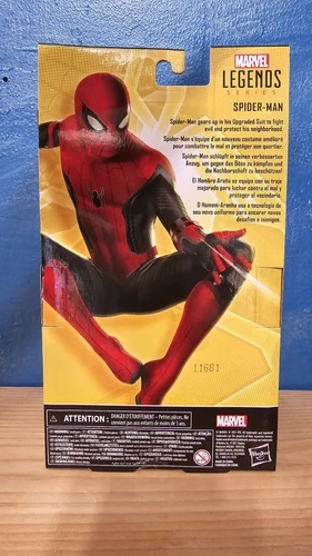 This Hasbro Marvel Legends Spider-Man action figure features the upgraded suit. Accessories include a pair of web-shooting hands, Tom Holland interchangeable head, Spider-Man interchangeable head, and one web accessory for posing in mid-air. The bottom of the box has some scratches. The item is unopened and brand new.