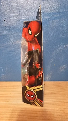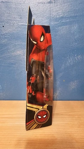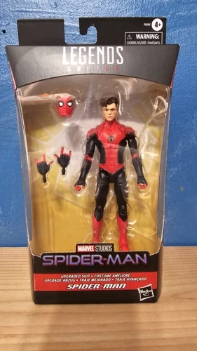 This Hasbro Marvel Legends Spider-Man action figure features the upgraded suit. Accessories include a pair of web-shooting hands, Tom Holland interchangeable head, Spider-Man interchangeable head, and one web accessory for posing in mid-air. The bottom of the box has some scratches. The item is unopened and brand new.