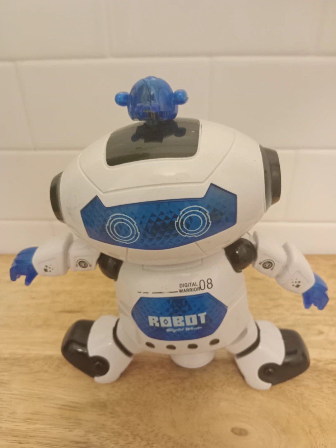 This is a dancing robot toy. It's white and blue with fun lights. It's great for kids who love robots! Might need to buy some batteryies
