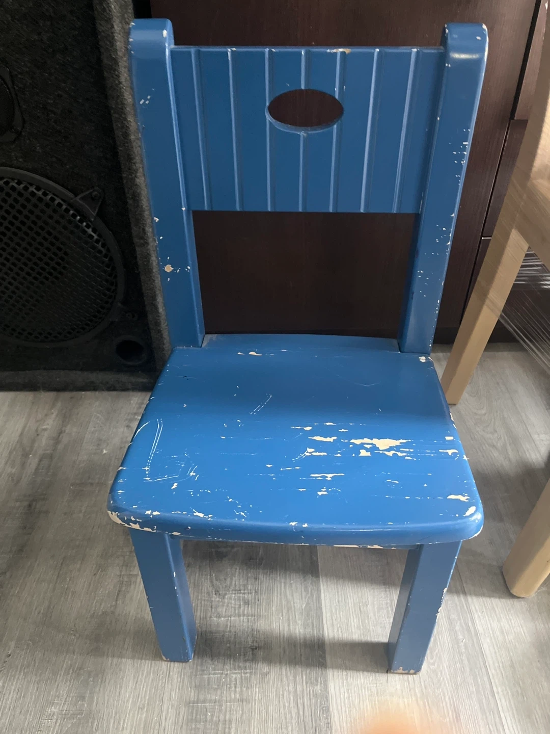 A sturdy blue wooden chair for kids. It's built for little ones and has a classic slatted back design. This chair is suitable for a child's room or play area.