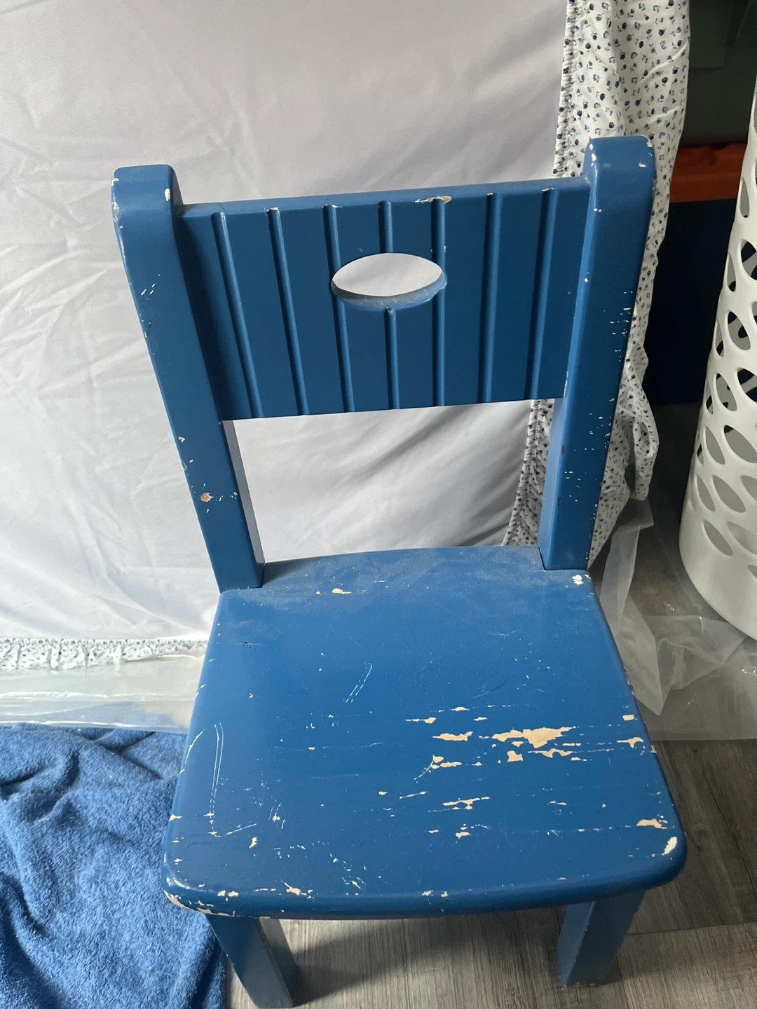 A sturdy blue wooden chair for kids. It's built for little ones and has a classic slatted back design. This chair is suitable for a child's room or play area.