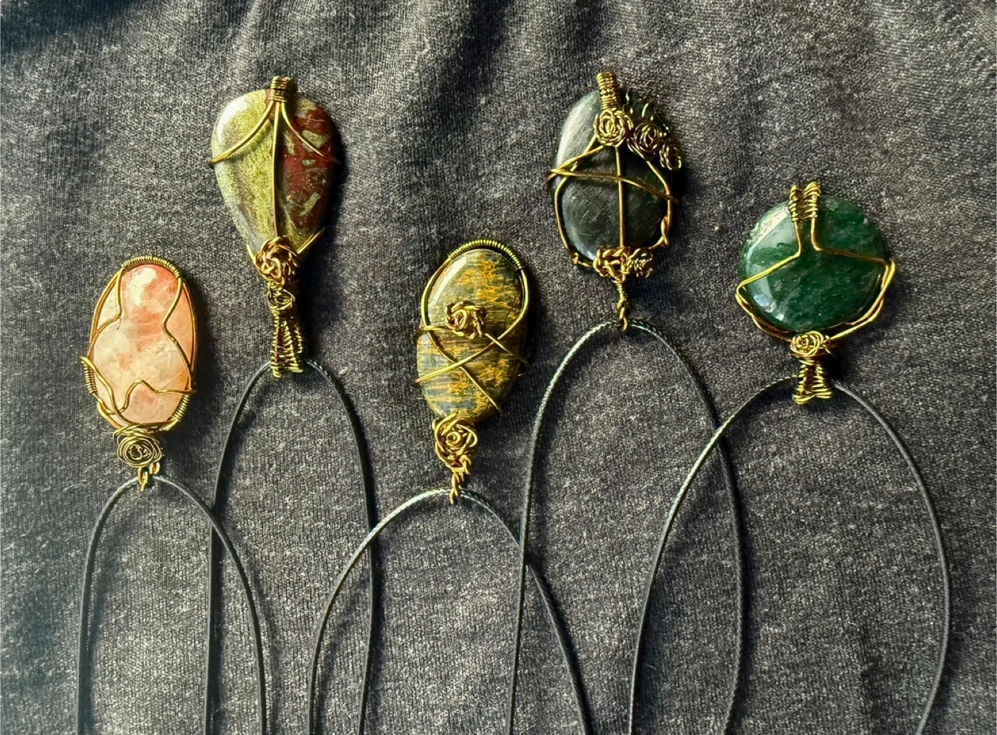Selling a set of five handmade unique wire-wrapped gemstone pendants. Each stone is beautifully encased in brass-tone wire and hangs on a black cord necklace. These pendants offer a touch of natural beauty and artisan craftsmanship.