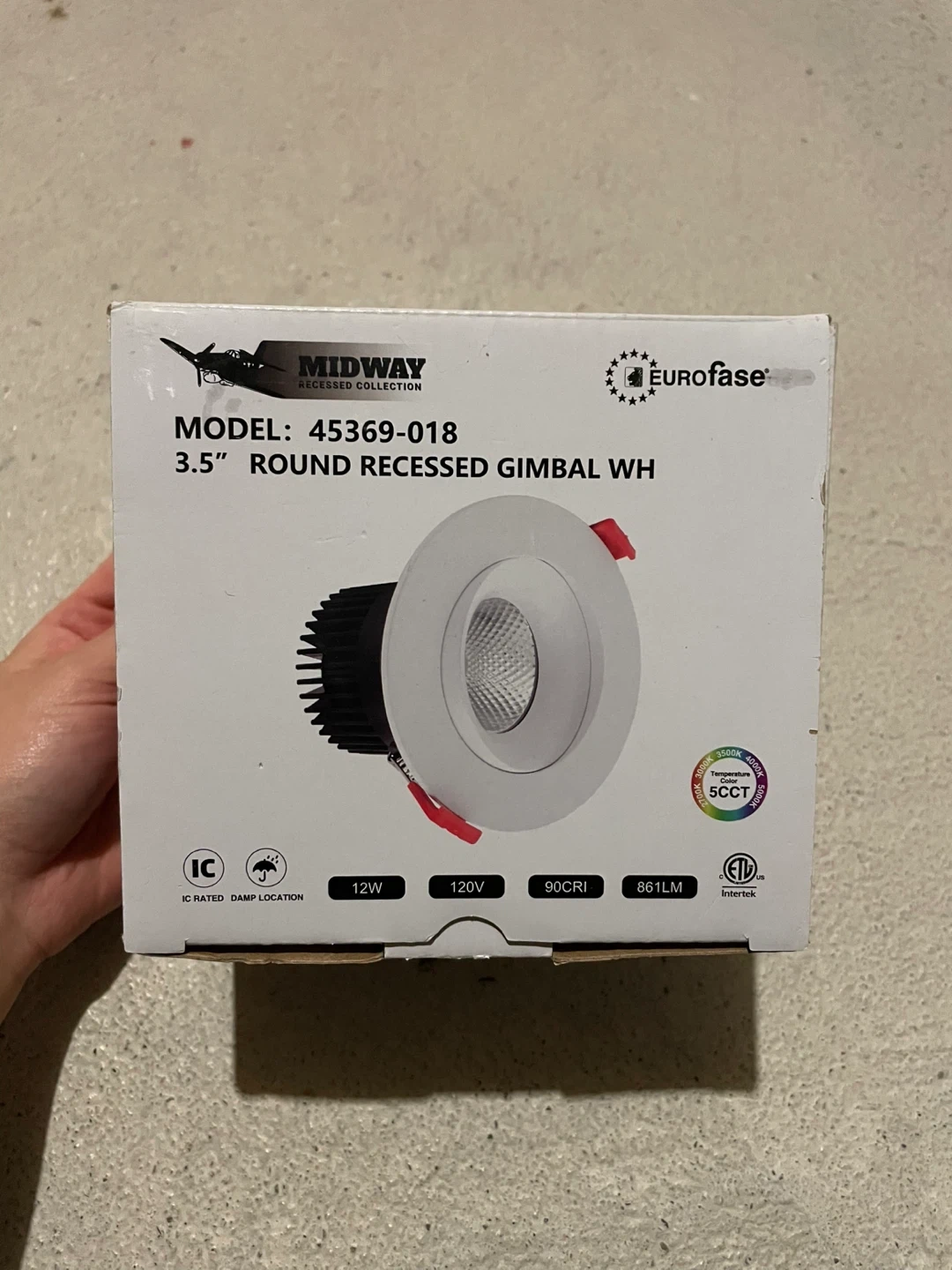 Eurofase Midway 3.5" recessed gimbal light. It's 12W, 120V, and 861LM. IC rated for damp locations.