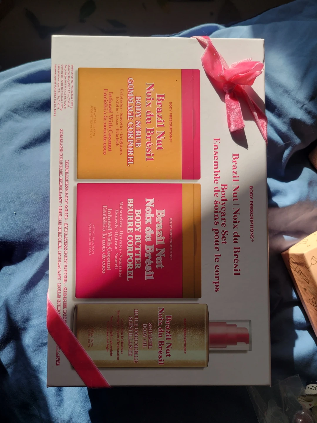This Body Prescriptions Brazil Nut Bodycare Set includes body scrub, body butter, and shimmer body oil. All items are infused with coconut. The body scrub is 23.6 oz, the body butter is 17.6 oz, and the shimmer body oil is 3.7 fl oz.