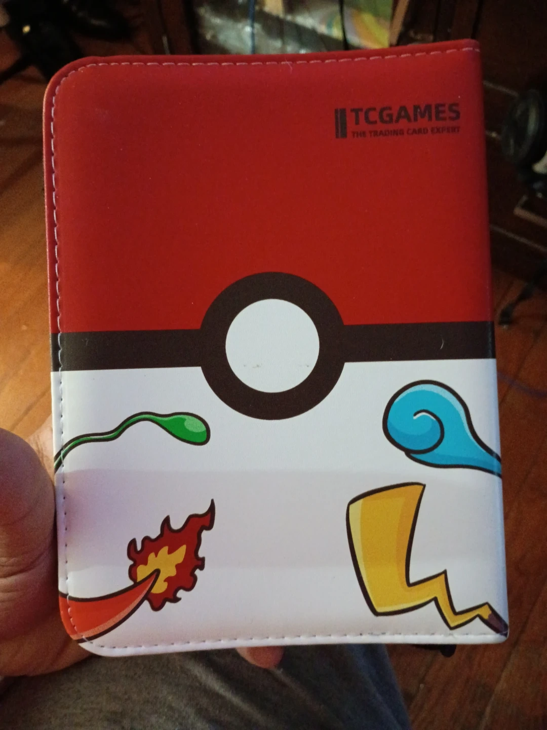 This TCGAMES binder features a Pokemon-inspired design with a Pokeball pattern. It's designed for trading card storage. The cover has a red and white exterior with various Pokemon-themed graphics.