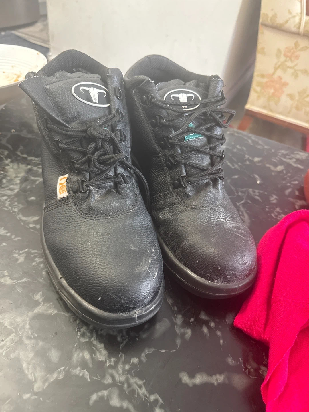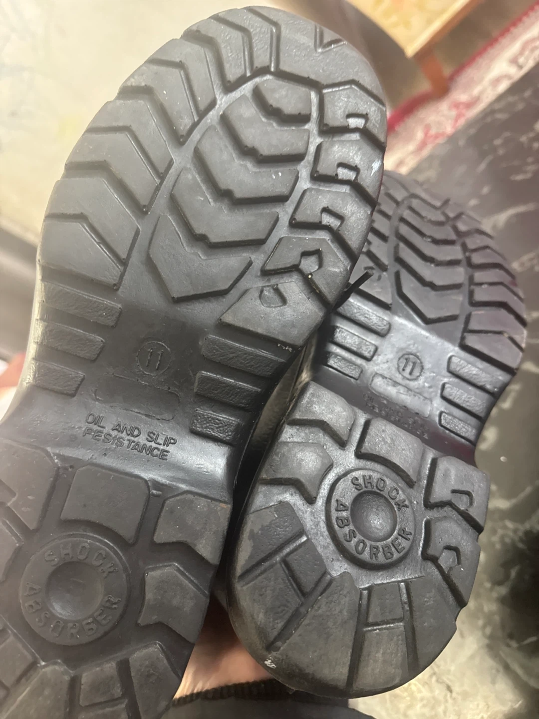 Black work boots with oil and slip resistance. They feature a shock absorber sole and a reinforced toe. Size 11 is clearly marked on the soles.