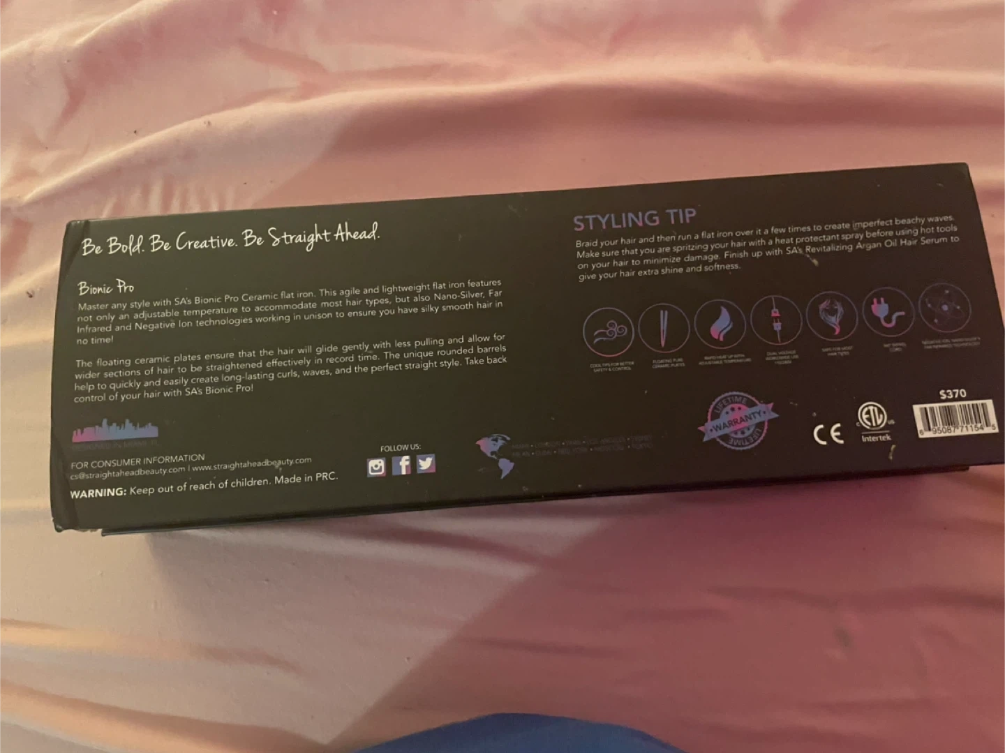This SA Bionic Pro flat iron features ceramic plates and negative ion technology for silky smooth hair. It offers adjustable temperature settings for various hair types. The floating plates ensure smooth gliding and prevent pulling. The box is broken tho.