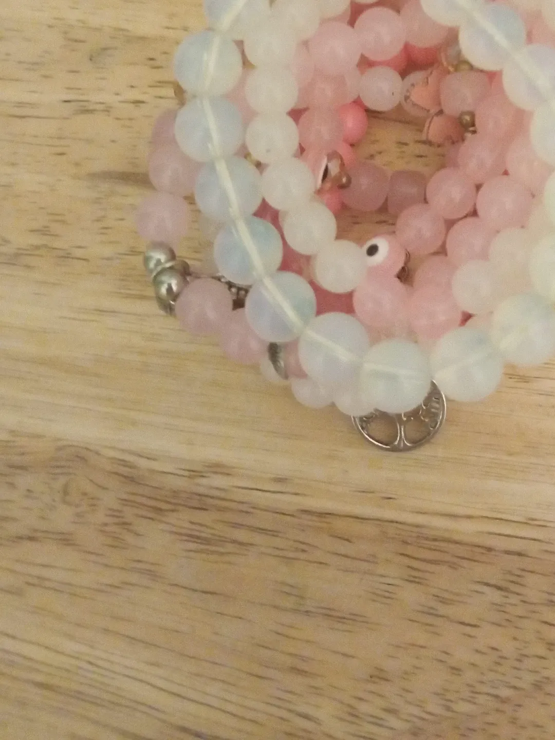Set of beaded bracelets in pink and white. Features a charm with a tree of life design. Elastic closure for easy wear.