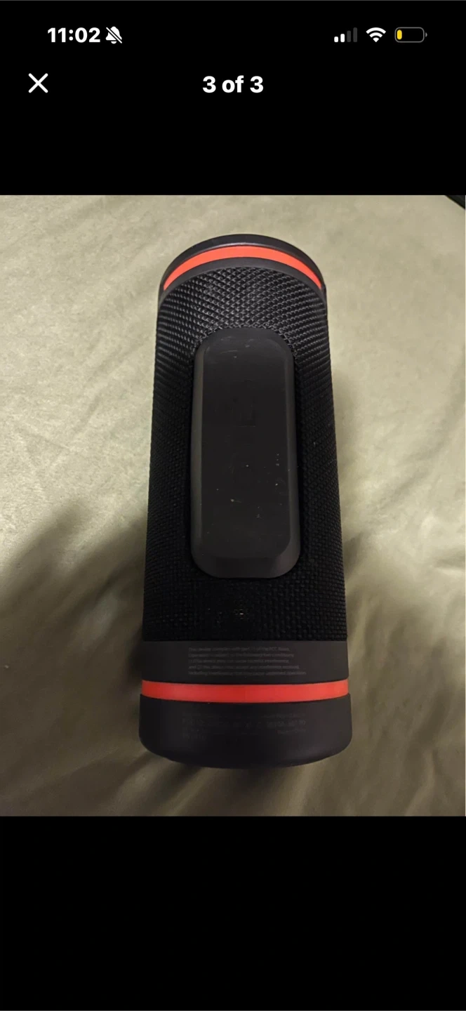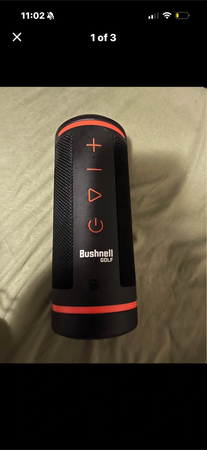 This Bushnell Golf portable Bluetooth speaker is black with orange accents. It's designed for outdoor use and offers a compact, durable solution for listening to music on the course. Connect your device easily and enjoy your tunes!