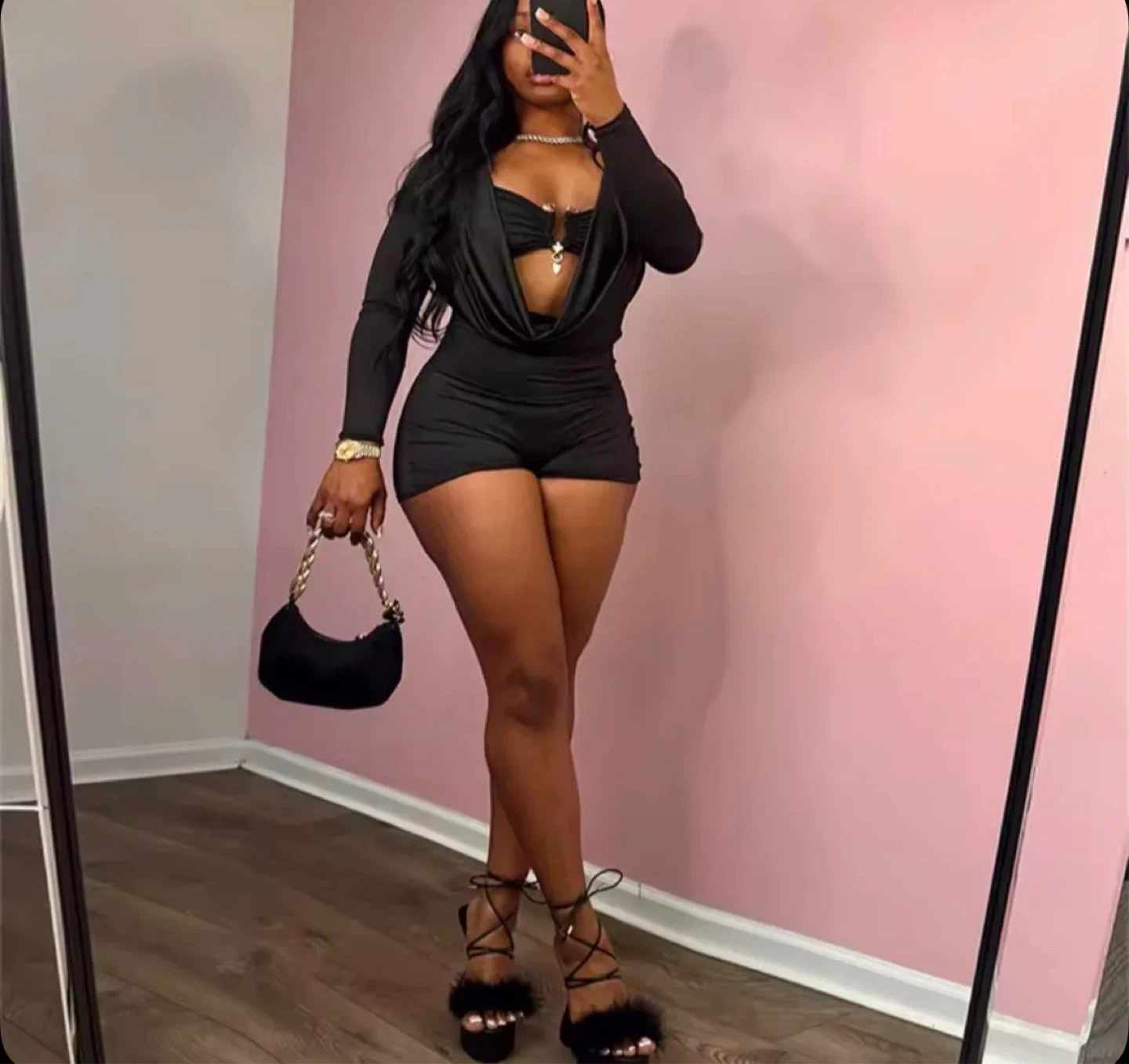 This stylish black set includes a cowl neck long-sleeve bodysuit and matching shorts. It's made from a stretchy fabric for a comfortable fit. This outfit is super cute for a night out!