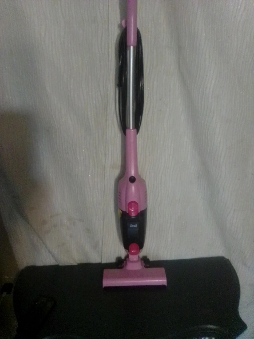 This is a pink handheld vacuum cleaner. It's lightweight and easy to maneuver. The vacuum comes with a cord for power.very quiet 🤫.